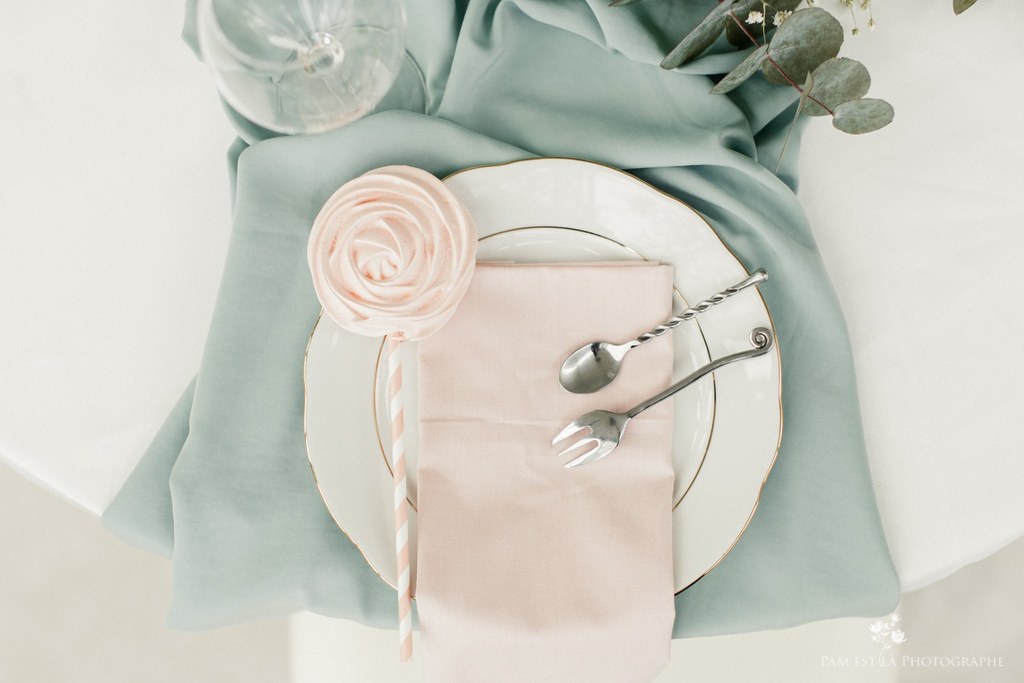 « Les couleurs de ce shooting sont le vert d’eau et le corail/rose, des couleurs acidulées et référents au printemps. La table d’inspiration et la table des gourmandises sont dans ses tonalités. Donc c’est un shooting à publier sous peu de temps! »