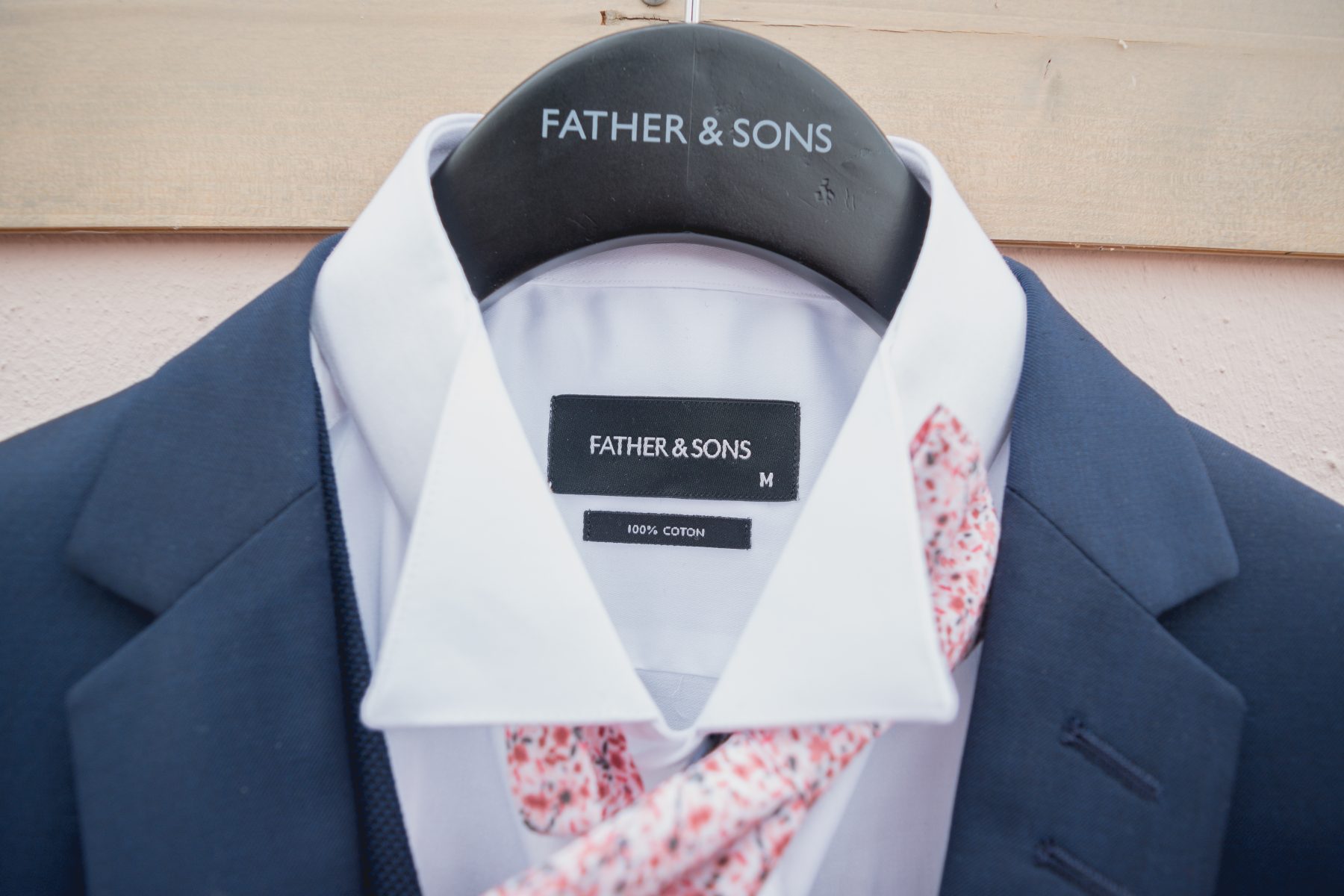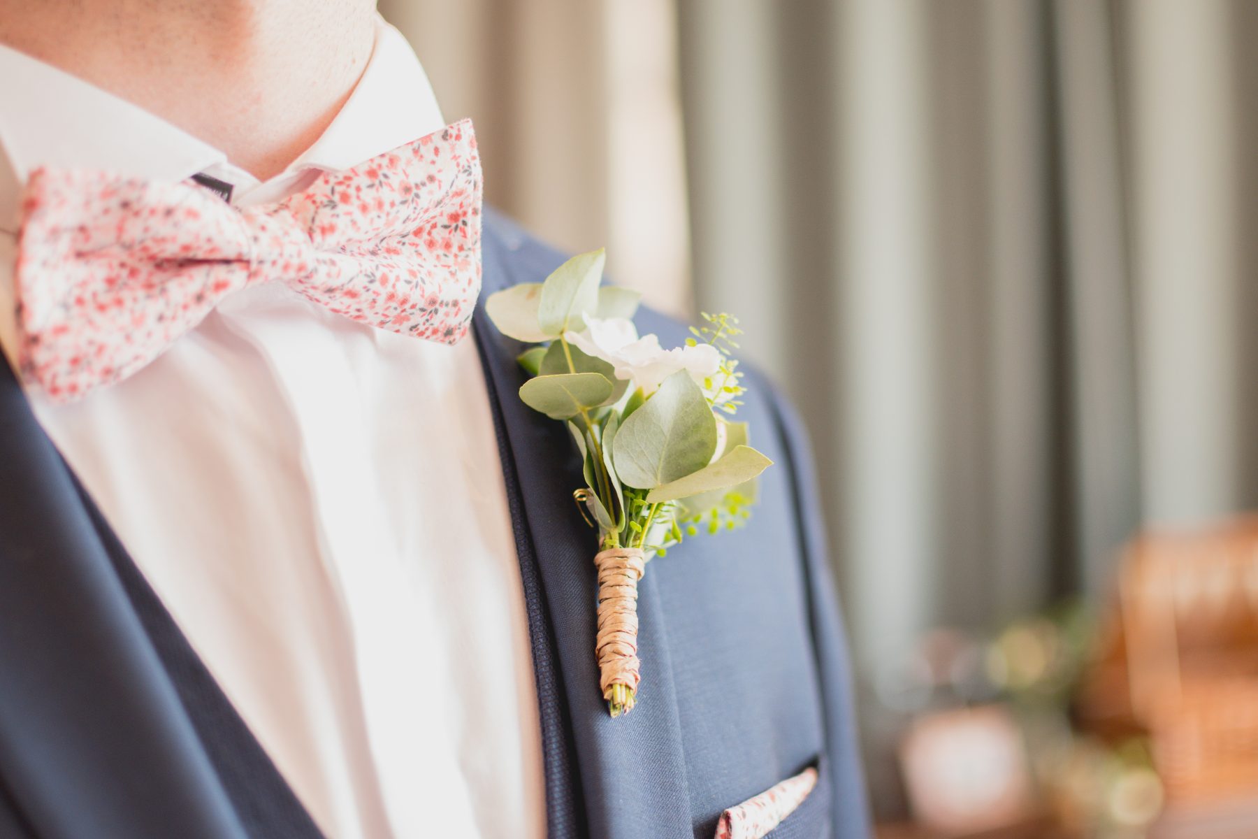 Les accessoires : ceinture, lacets de chaussures, boutons de manchette, nœud papillon et pochette aux motifs liberty proviennent également de F&S. Les fleurs à la boutonnière viennent ajouter la touche champêtre à ce costume très élégant. »