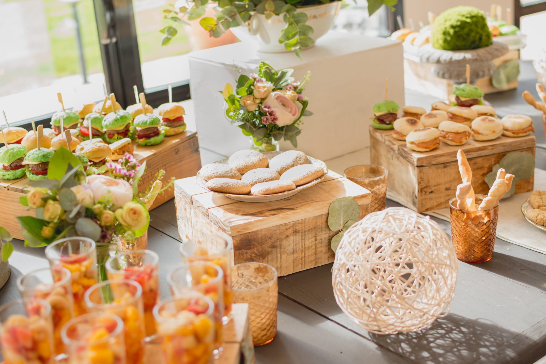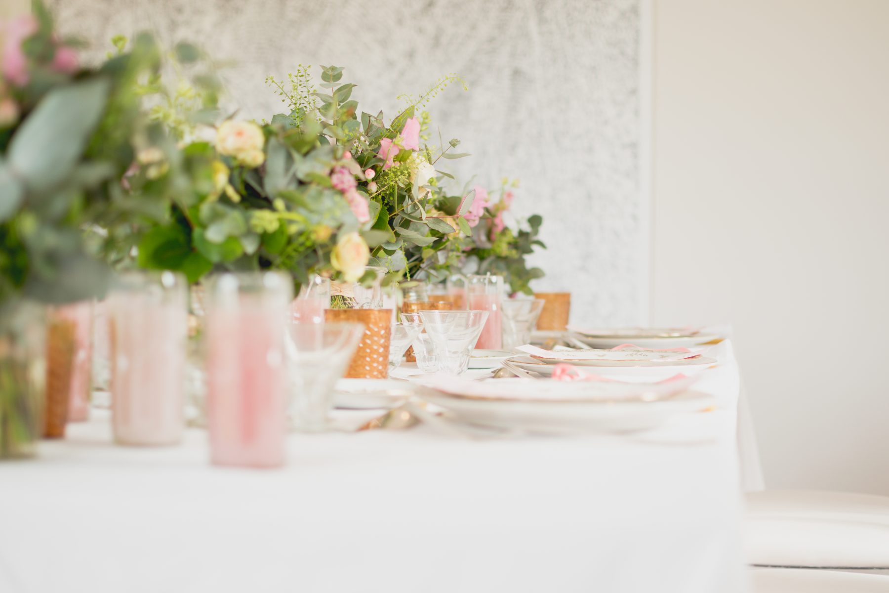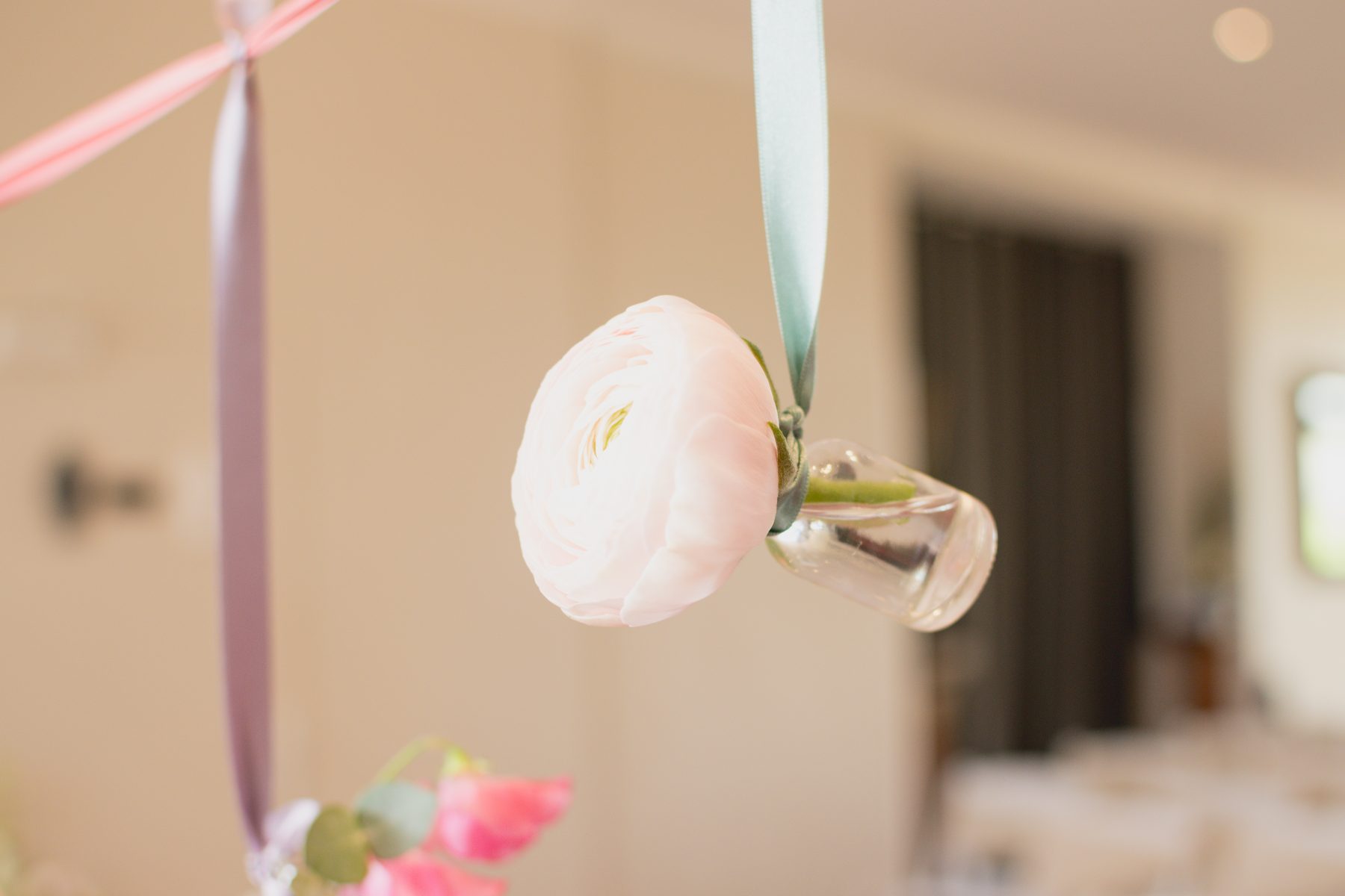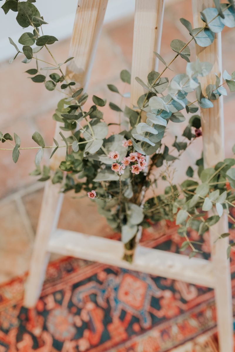 Côté déco, les fleurs, les feuillages y sont à l’honneur : Renoncules, pieds d’alouette, poids de senteurs, wax fleurs, thlaspi green bell, pittosporum, eucalyptus, roses branchues, mini œillets…