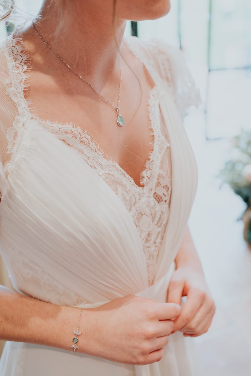 Côté robe de mariée, les tissus fluides apportent une sobriété élégante collant au thème bucolique. La dentelle quant à elle vient apporter la touche romantique indispensable. J’ai eu un véritable coup de cœur pour Capucine de Naomie’s Closet : ce modèle est en parfaite harmonie avec l’ambiance romantico-bucolique que je désirais.