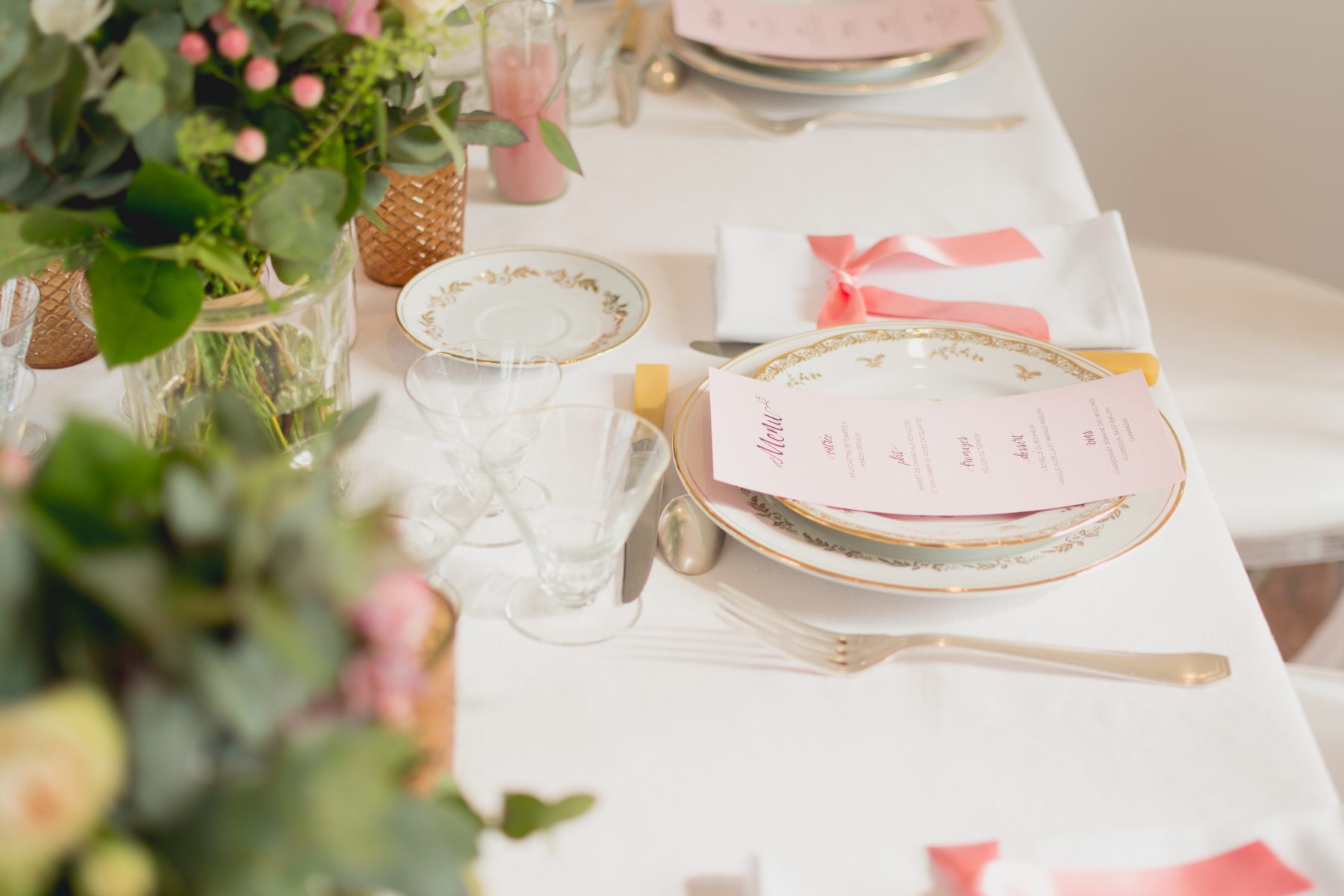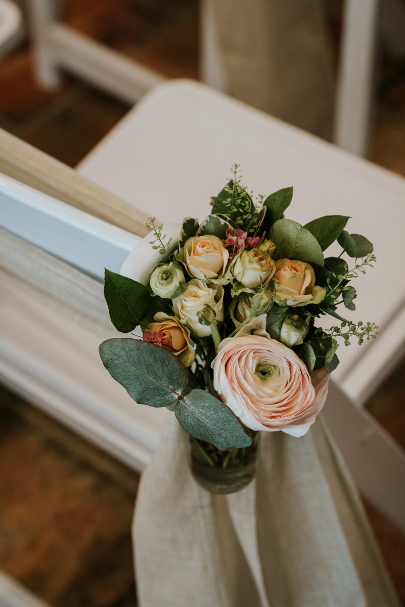Côté déco, les fleurs, les feuillages y sont à l’honneur : Renoncules, pieds d’alouette, poids de senteurs, wax fleurs, thlaspi green bell, pittosporum, eucalyptus, roses branchues, mini œillets…