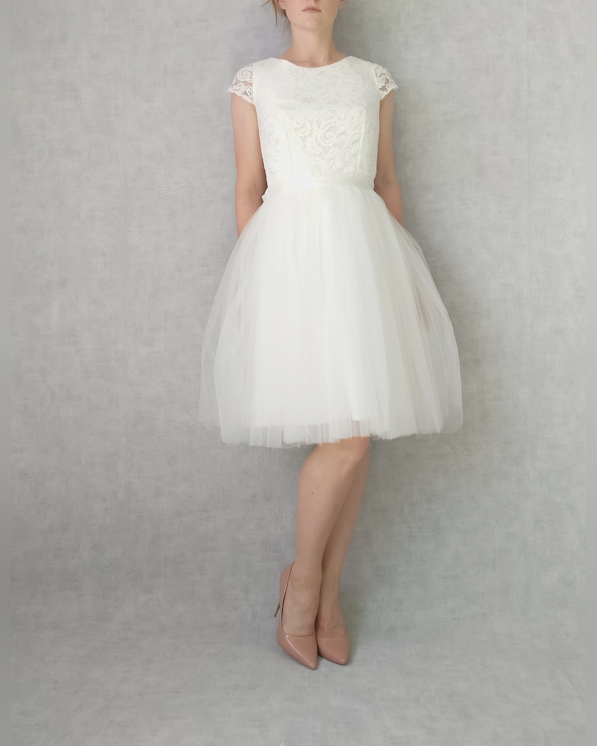 « Je travaille beaucoup sur des modèles mi-longs. Ce sont des robes de mariées à part entière qui peuvent aussi bien être portées pour un mariage civil que religieux. «