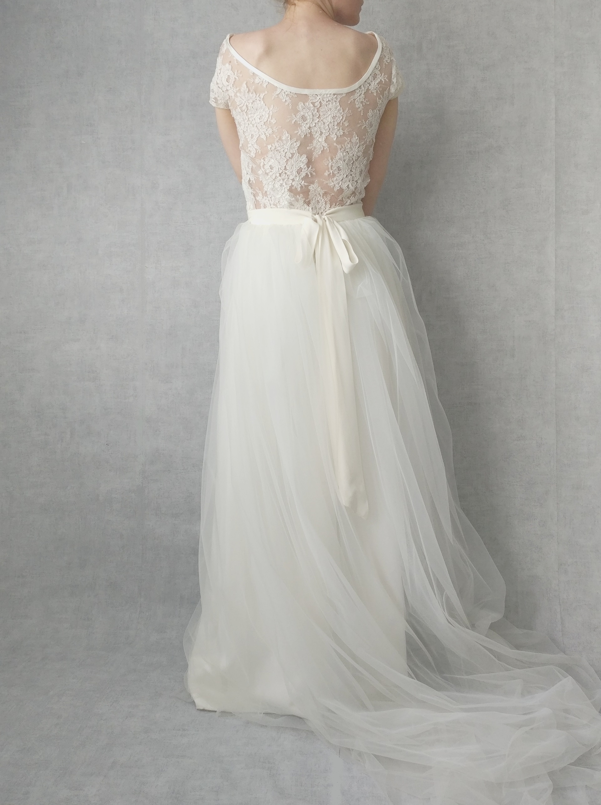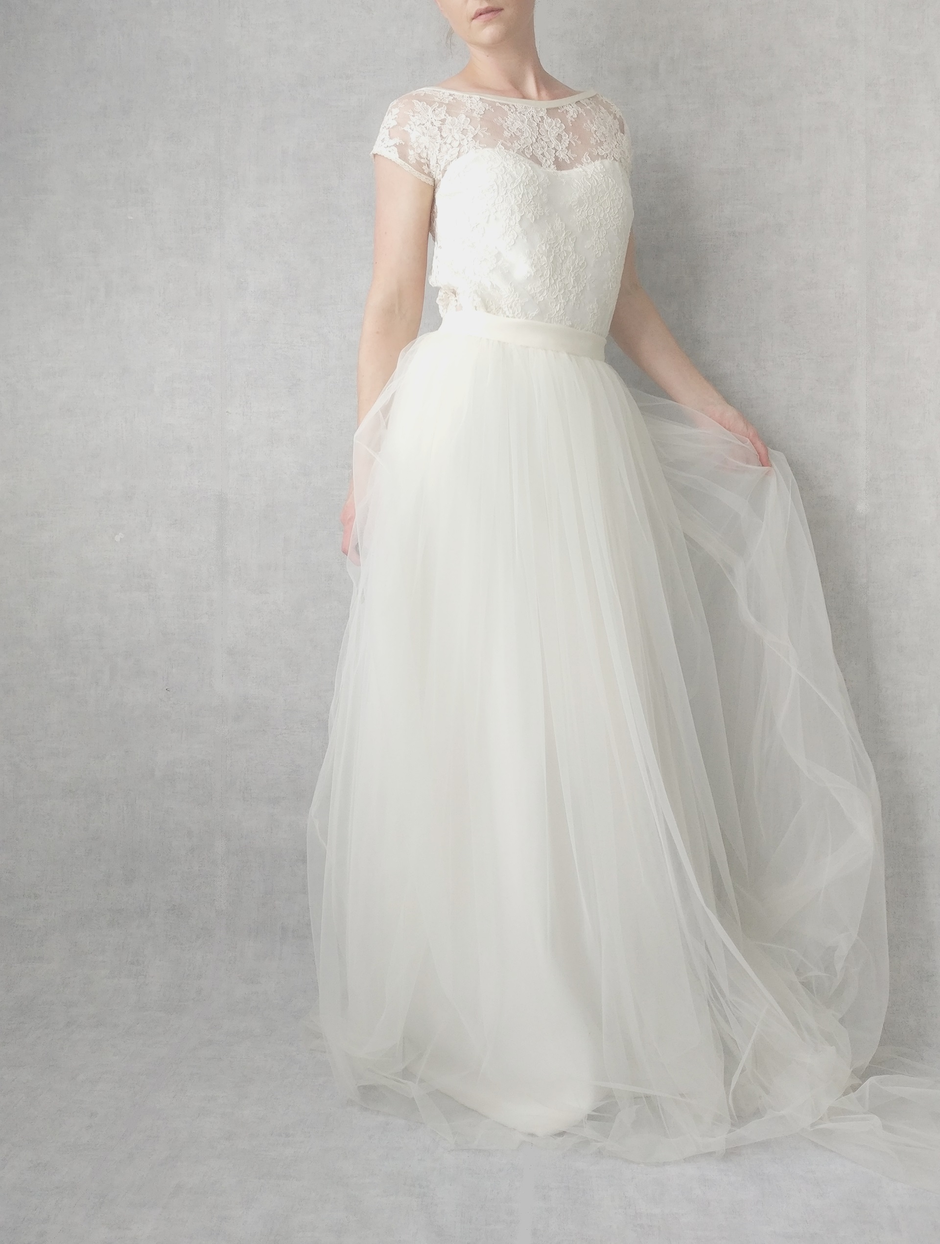 Beaucoup de nos modèles sont composés d’un top et d’une jupe séparés. Les mariées sont souvent très enthousiastes à l’idée de pouvoir reporter une partie de leur robe par la suite. Un top en dentelle se reporte très facilement en d’autres occasions. Tout simplement avec un jean et une petite veste. »