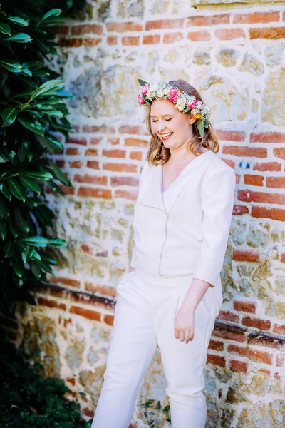 Une originalité marquée par la combinaison pantalon dont les deux matières accordées permettent à la mariée d’afficher un look à la fois rock et moderne.