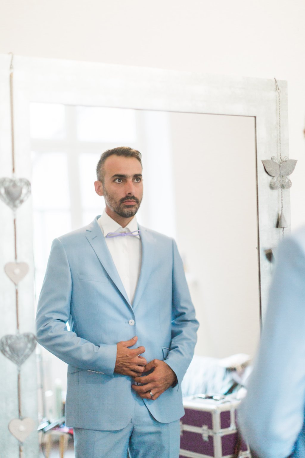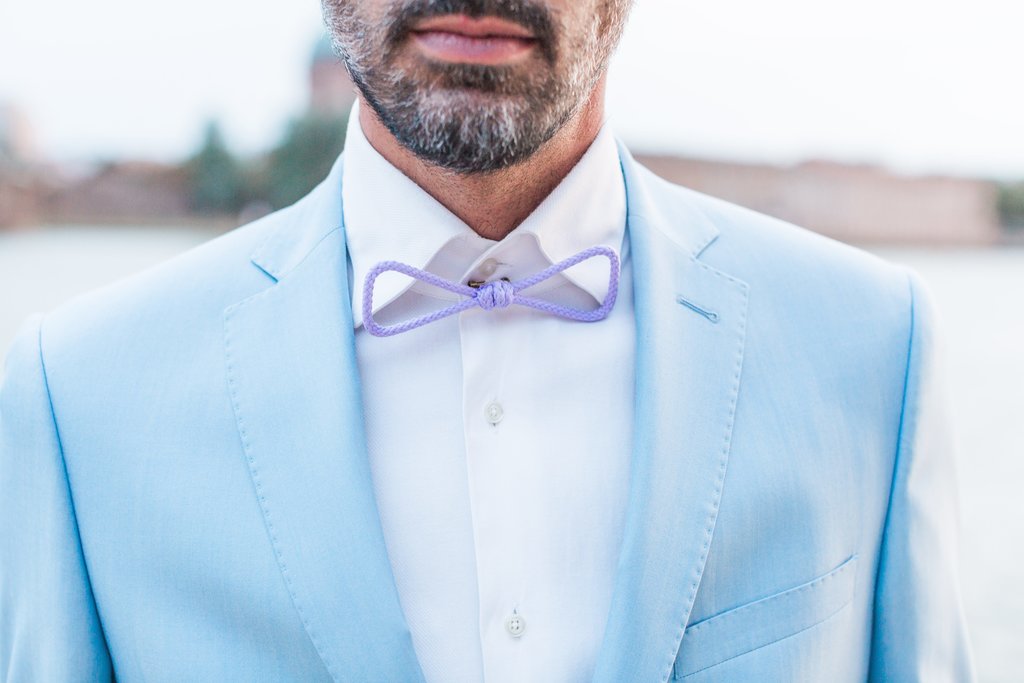 Une touche de modernité caractérisée par l’original noeud papillon et de luminosité apportée par la tenue bleu ciel du marié.