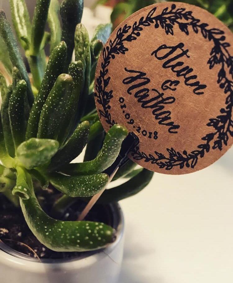 Pour le coté rustique nous avions mis une photo de nous enfant en noir et blanc et on l’avait personnalisé dans nos couleurs.