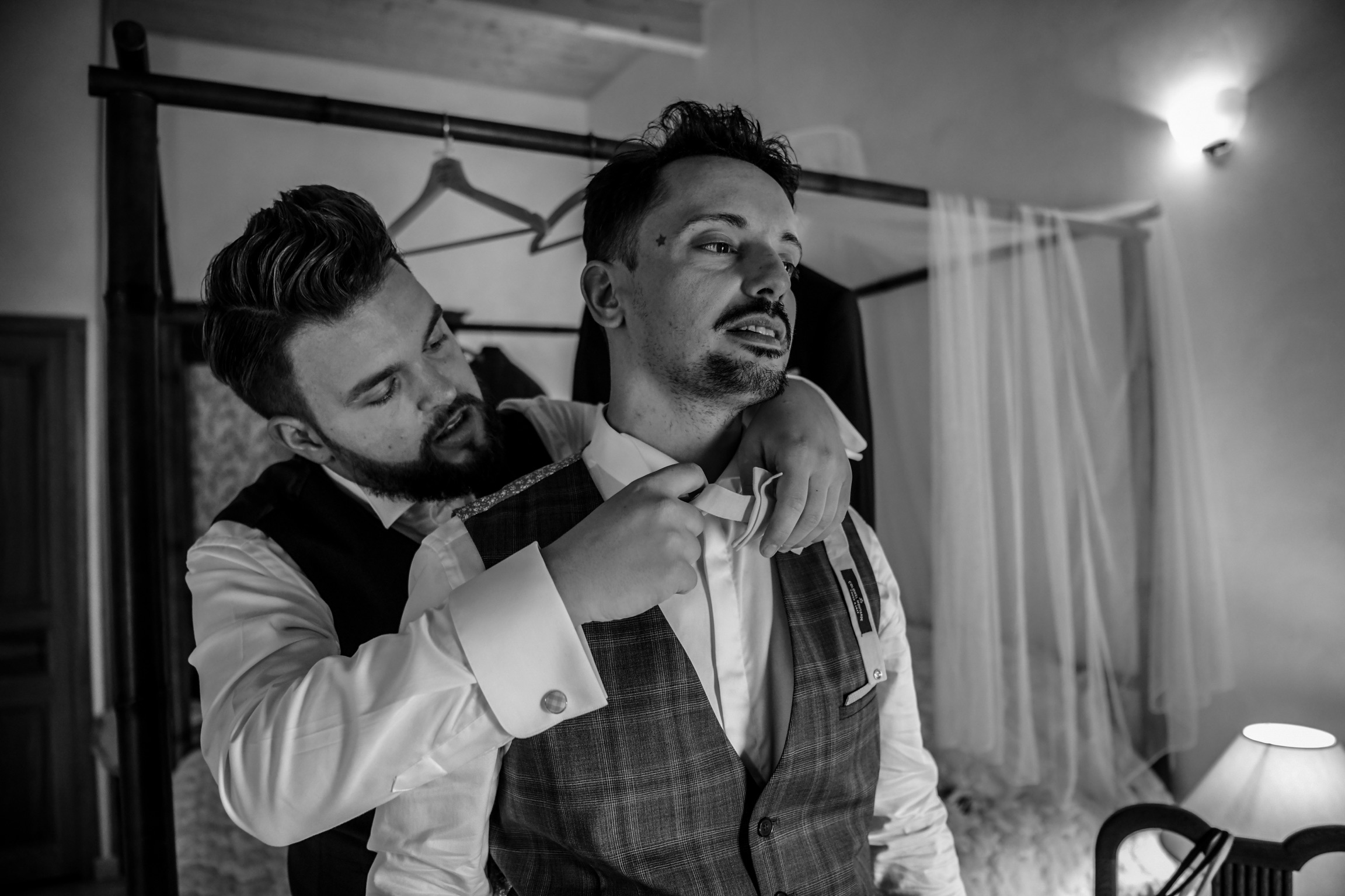 Le jour J j’étais plutôt détendu. Nous avions terminé les installations extérieures vers midi, nous avons fait un petit briefing avec notre fleuriste puis notre photographe. Et nous avons été nous préparé dans notre chambre que nous avions pris au domaine.