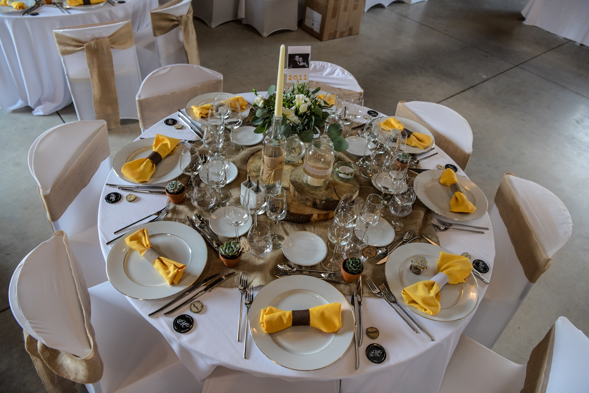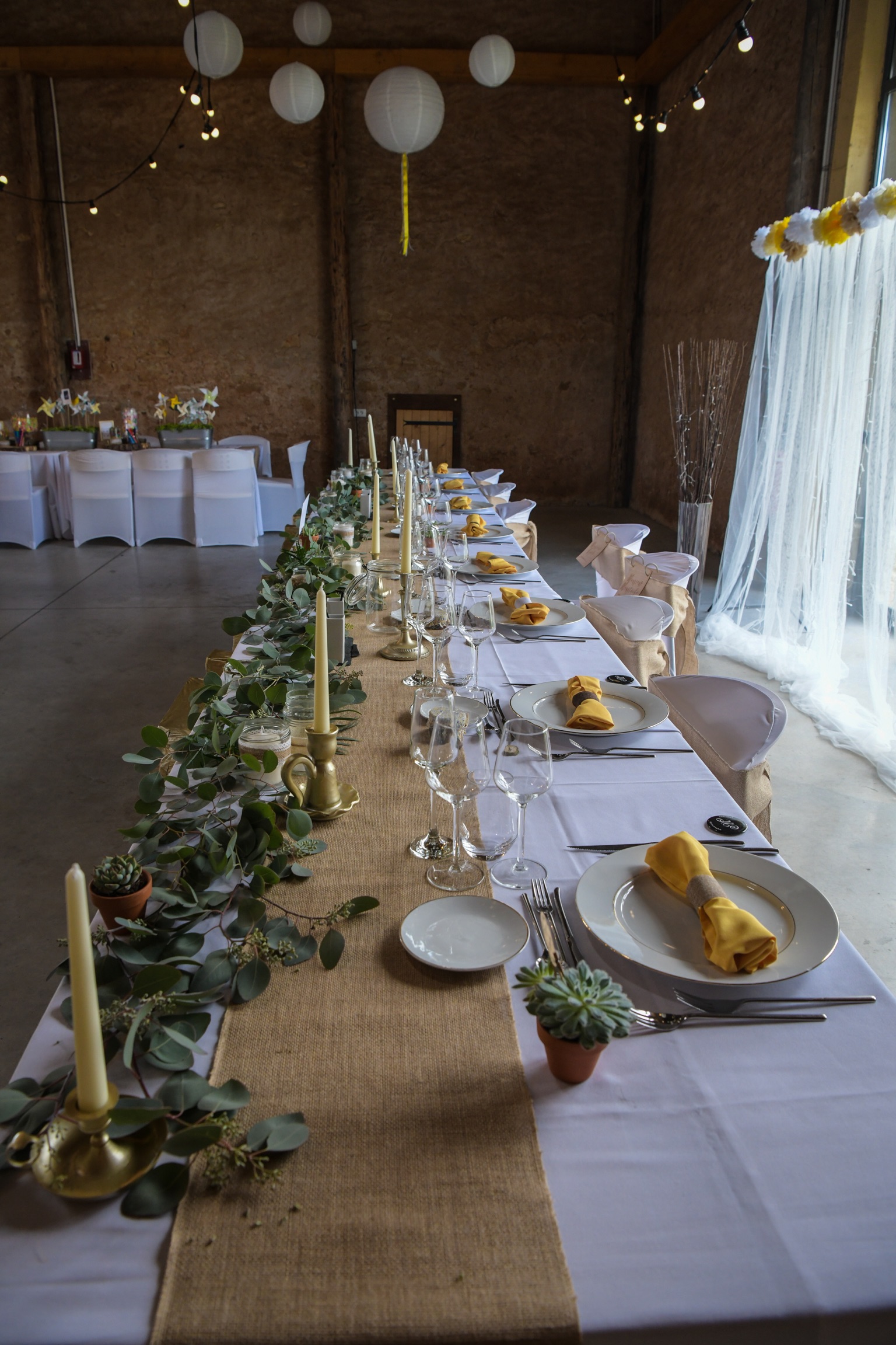 Nous avions également imposé un dress code à nos invités, dans un mariage « classique » personne ne met de blanc pour respecter la mariée. Nous, nous n’avions pas de robe blanche, il fallait qu’on puisse ressortir au milieu de nos invités, du coup nous avons imposé un dress code au teintes naturelles blanc beige brun avec une petite touche de jaune pour l’accessoire. Le jaune représente la couleur du soleil et du bonheur, c’est une couleur que nous avions choisi pour donner du peps à notre déco naturelle.