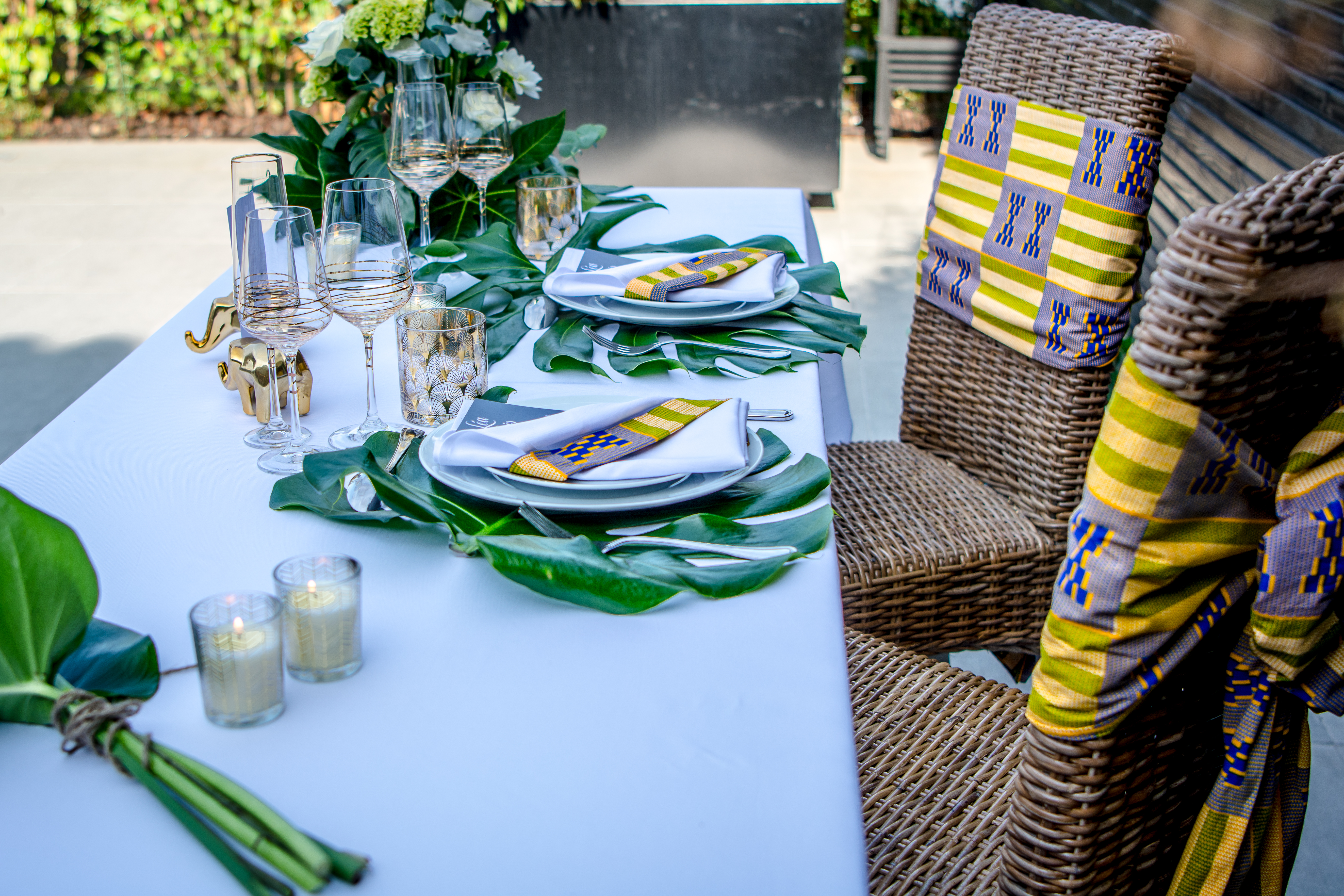 Nous avons joué sur le mélange des tissus et des matières pour ne pas qu’un côté prenne le dessus sur l’autre. Ainsi, l’or rencontre le bois, le tissu wax réhausse le bleu roi du costume, le blanc des fleurs assagit le vert des feuillages.