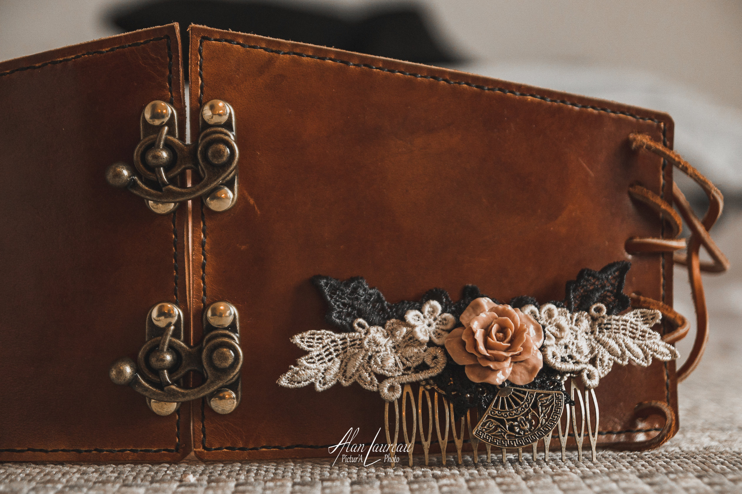 Les bijoux, (montres a gousset, bracelets en cuir, pince à cheveux, serre tête…) proviennent de la même association. La coiffure se veut décalée et stylisée. Le chignon est composé de rajouts de couleurs rouges, de mèches bouclées, et d’une belle pince à cheveux. Celle-ci réalisée par Jessica de Cheveux d’ange.