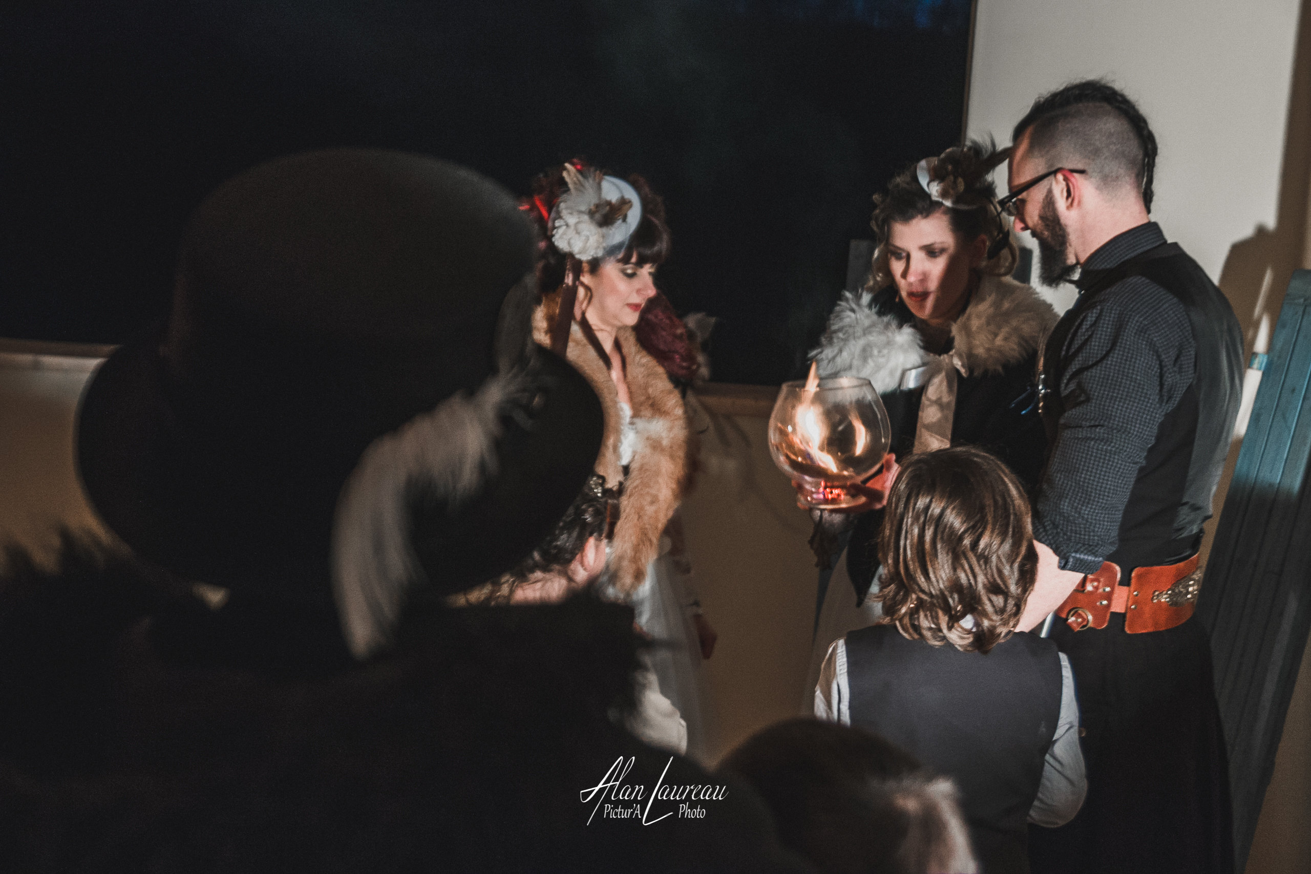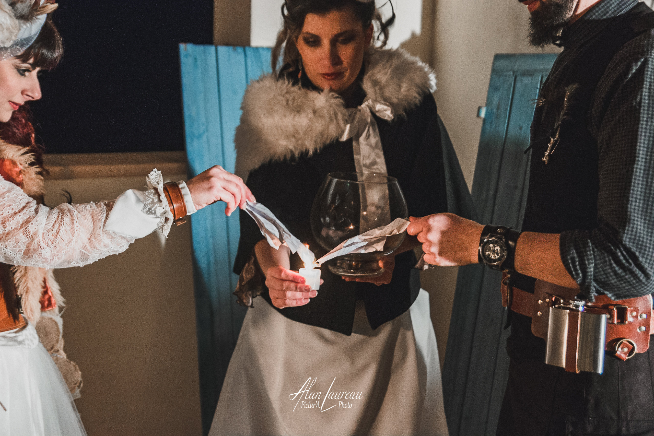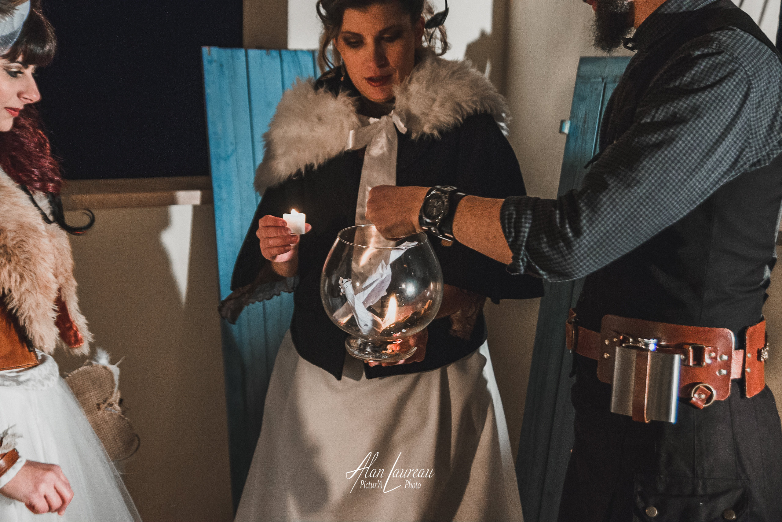 C’est le moment pour le photographe Alan de Pictur’Al de réaliser les photos des couples dans un décor unique. Près de la chapelle on découvre, un fauteuil en cuir imposant, quelques caisses en bois, un pendule, des lampes a huiles, un appareil photo et quelques bougies pour donner une ambiance intimiste. »