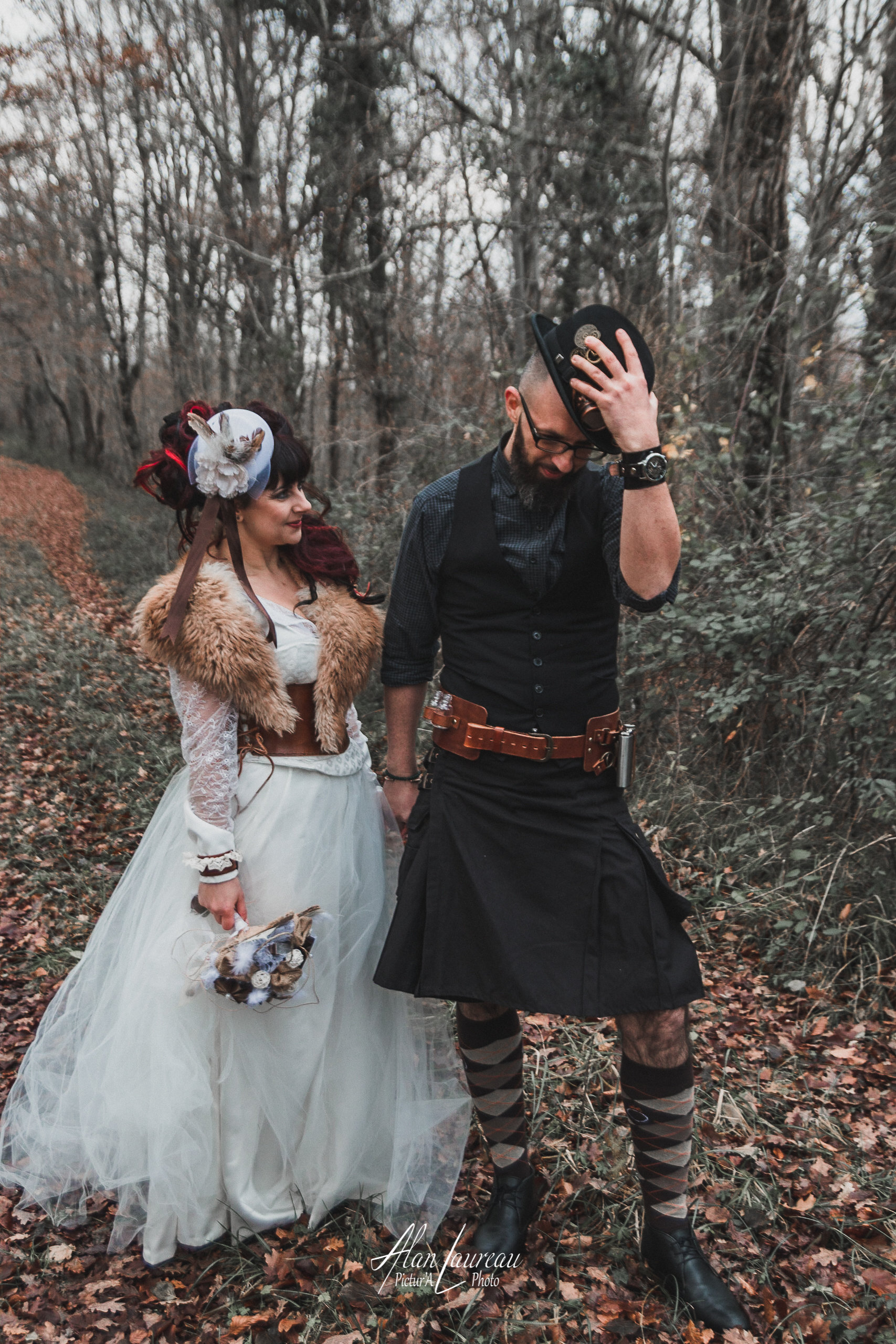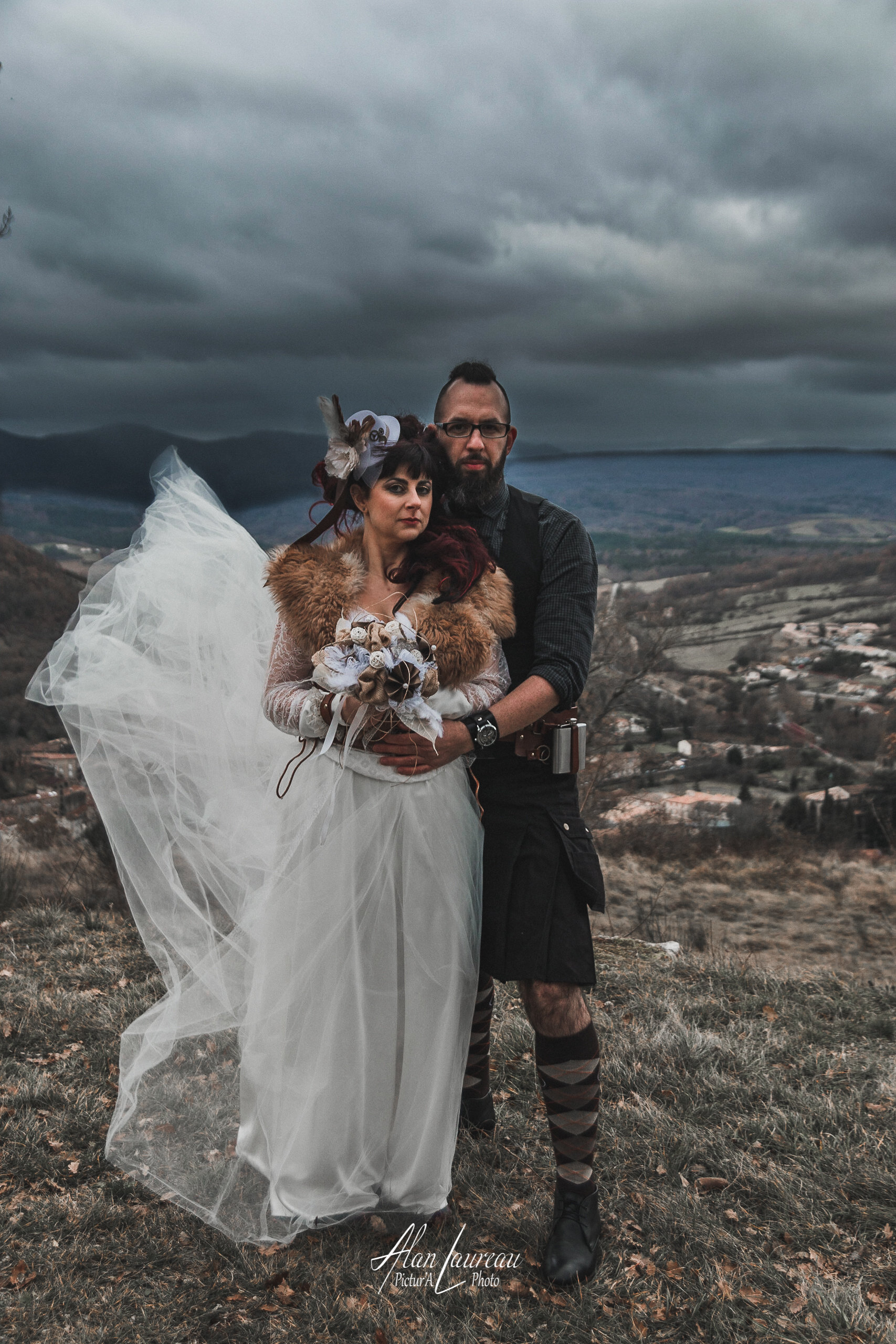 On casse les codes du mariage traditionnel avec cette inspiration qui met en scène un mariage décalé et baroque. Avec ce shooting réalisé en pleine nature dotée d’une vue particulière sur les montagnes, on s’accorde à imposer le Steampunk dans ce cadre.