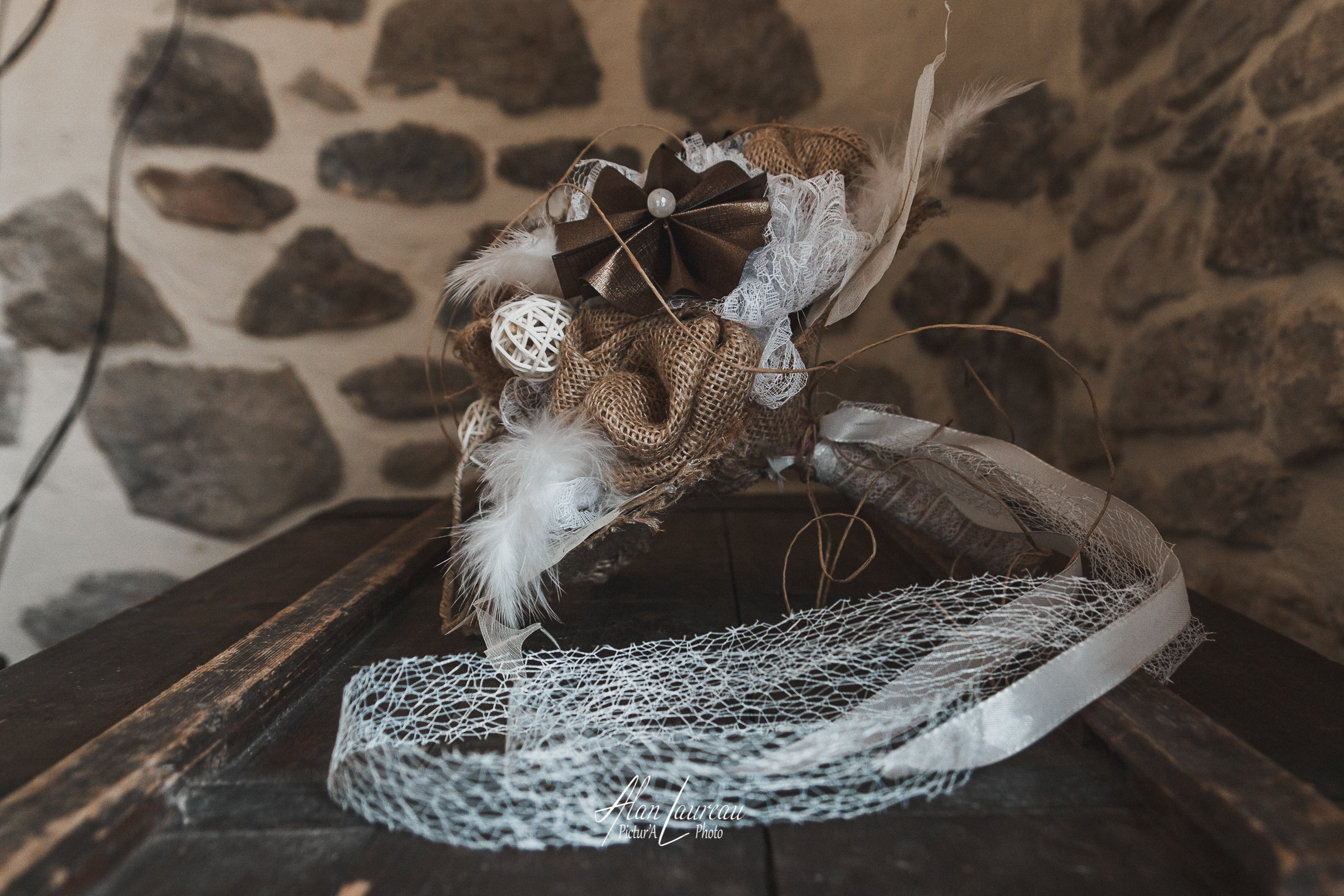 Il ne faut pas oublier, le joli bouquet de la mariée une création unique réalisé par Delphine de D Dream Event. Un bouquet fait de différentes matières naturelles, comme la plume, la toile de jute, le bois. »