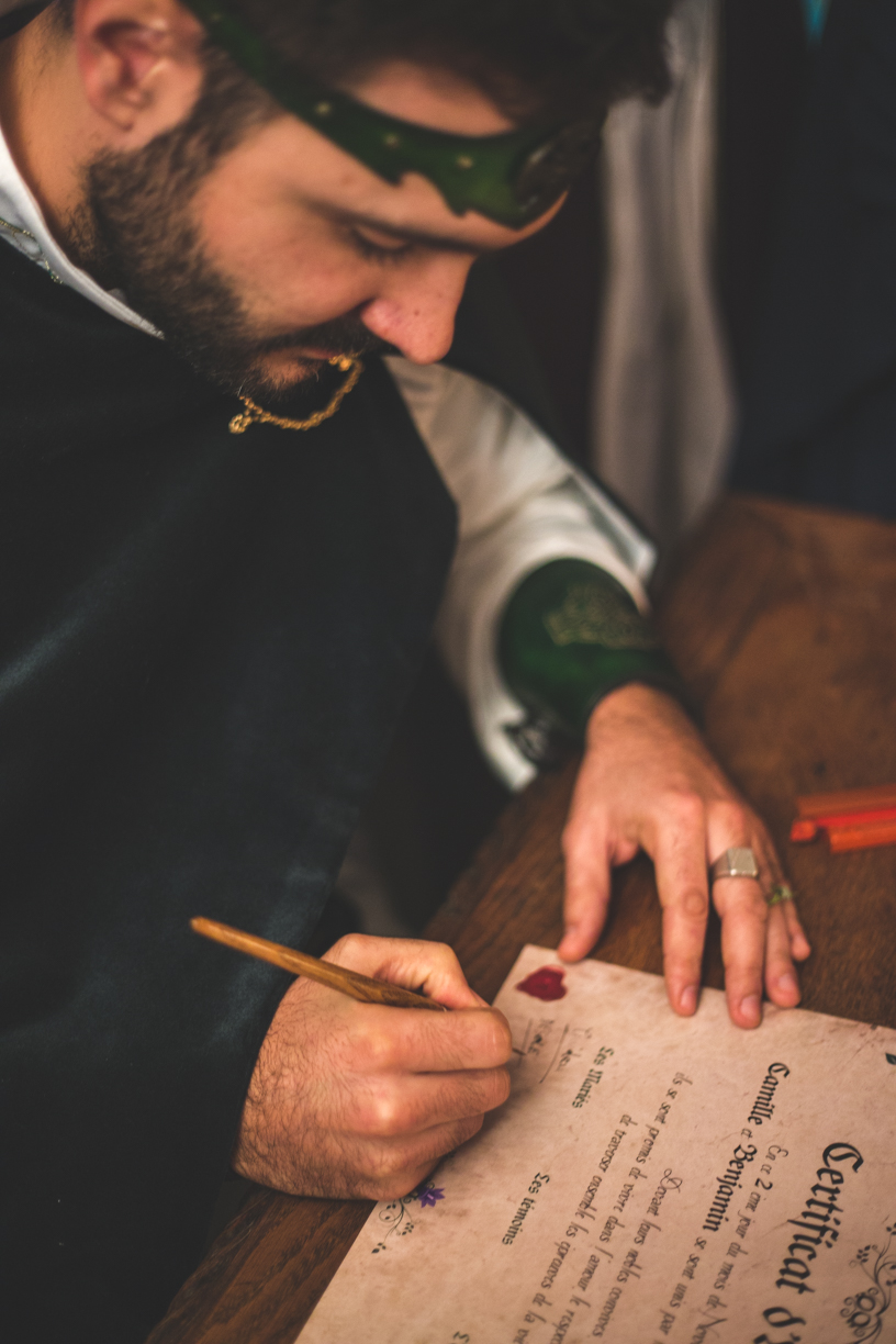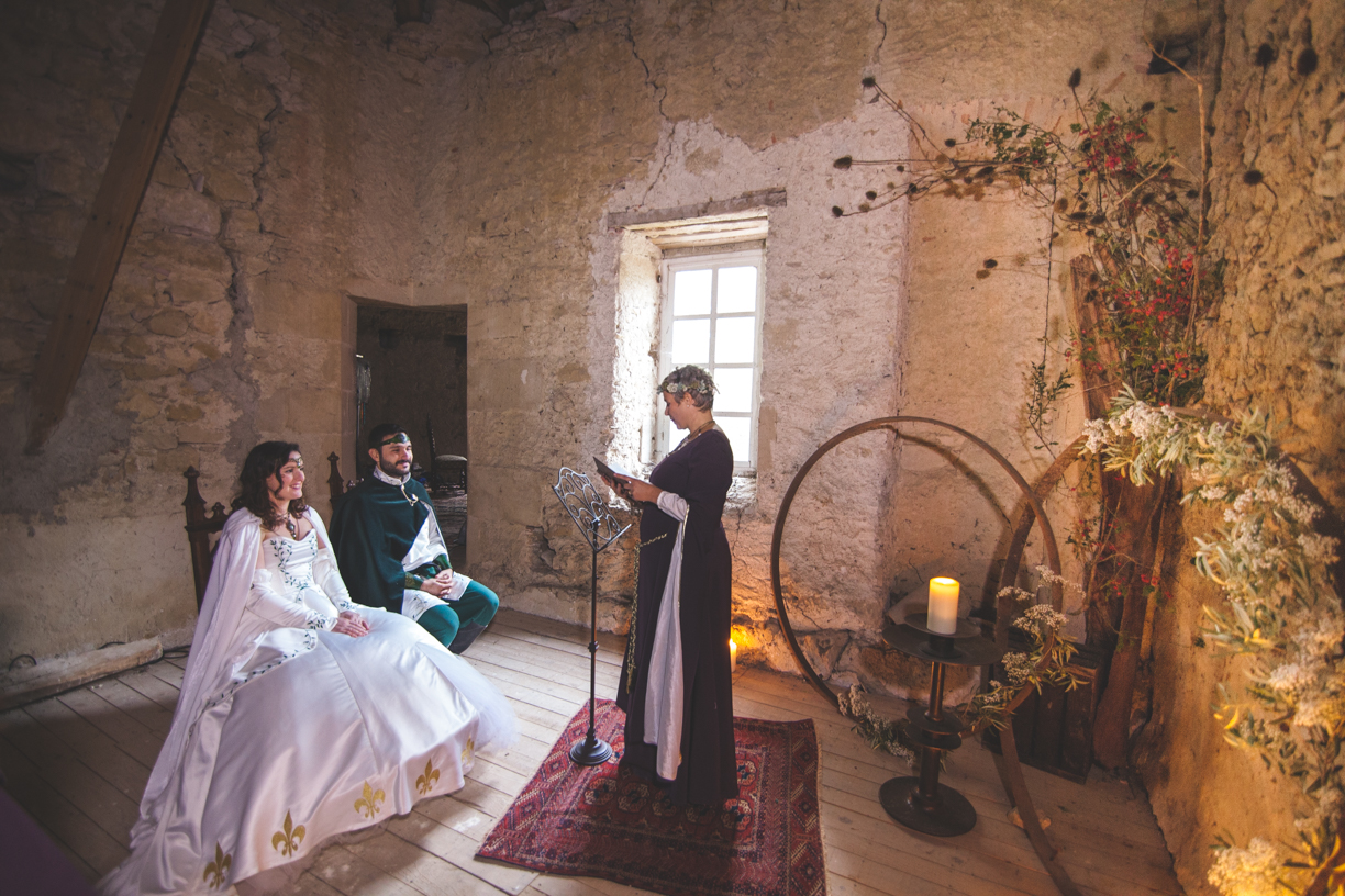 Organisatrice : Delphine Wedding Events/ Costumes Médiévaux : Fééries Couture / Créations en Cuir : Malv’Atelier & Atelier cuir Vitam Aeternam / Officiante : Céline Larigaldie Officiante / Maquillage : Des paillette et des ongles / Créatrice de bijoux : L’Atelier de Milla / Traiteur : l’Ateliette / Fleuriste : L’instant Bucolique / Magicienne : Ludisciences / Papeterie : PS by la Maleta / Location de décoration : L’atelier du Grenier / Lieu de réception : Château La Commanderie / Les Mariés : Camille & Benjamin