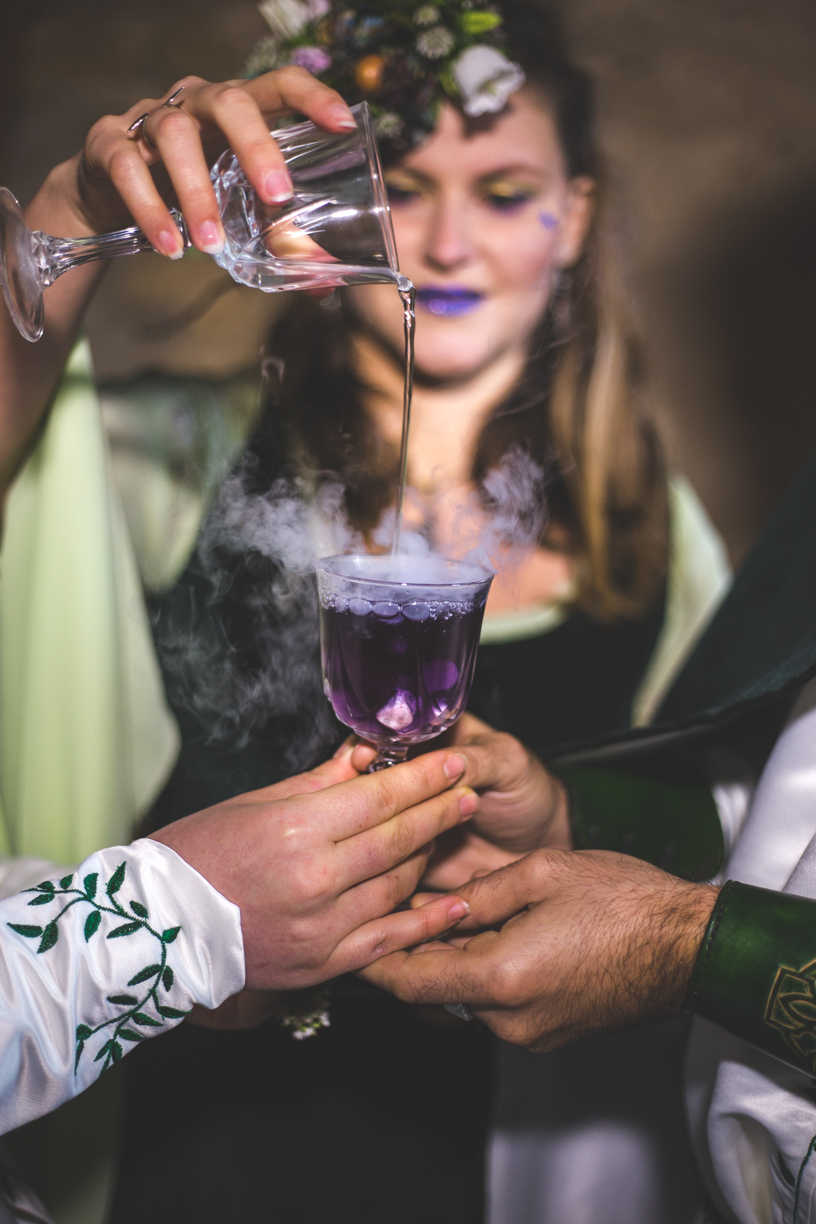 Chaque étape a été un nouvel émerveillement : les tenues, les accessoires, les bijoux, les couronnes, la cérémonie, le banquet … Tout! Nos mariés du jour sont en train de préparer leur « vrai » mariage, et ils ont apprécié cette première projection dans ce que sera leur grand jour. Et pour ajouter un peu de magie, nous avions fait appel à une magicienne qui nous préparé des potions d’amour qui changent de couleur et des cocktails fumants… »