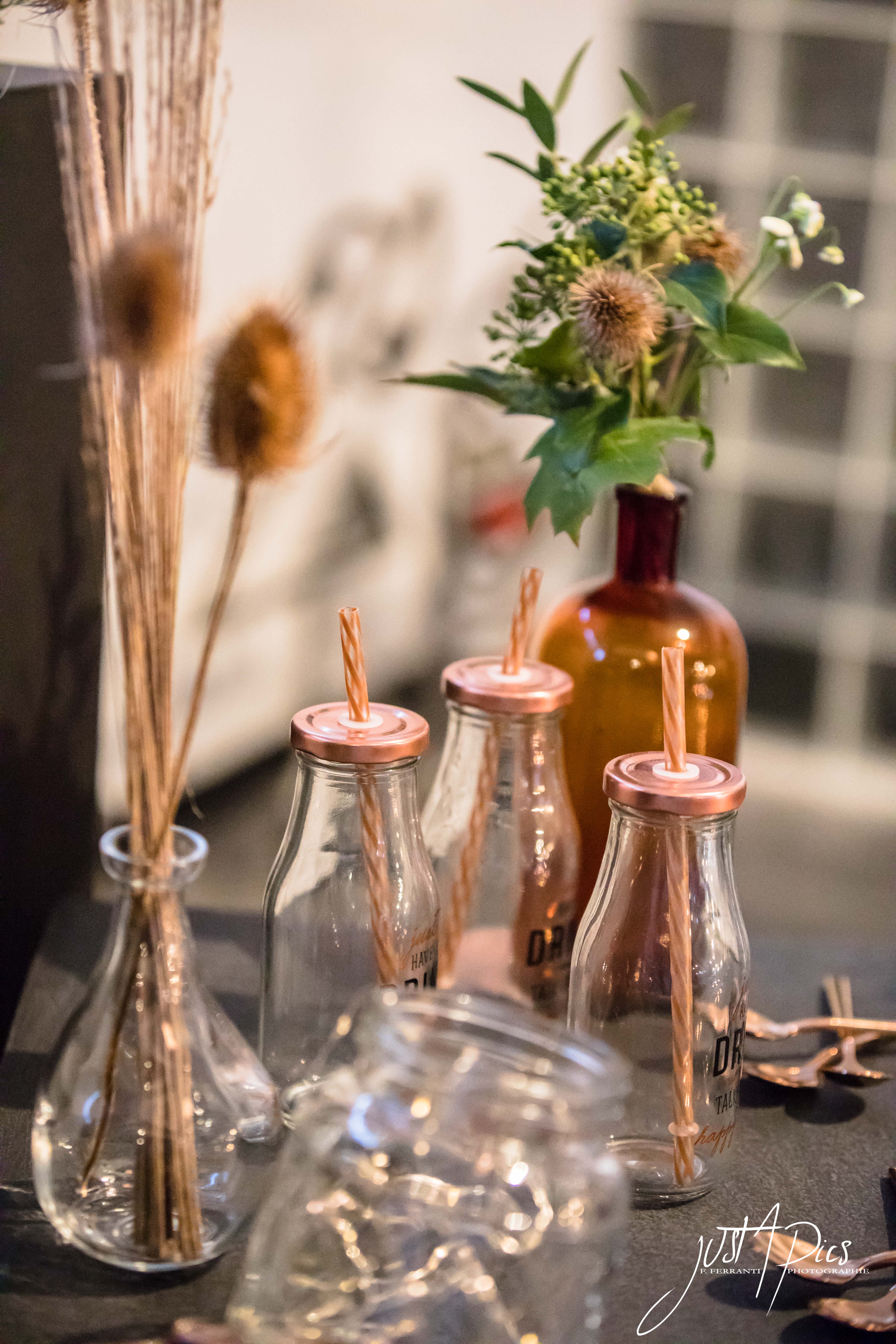 « Pour nos centres de table, nous avons privilégié le macramé, pour casser le côté brut et masculin de notre réception. Egalement des couverts cuivrés et quelques bouquets dans des bouteilles vintages ornées de plantes grasses. Une plaque en acier brut a été utilisée pour le numéro de table. »