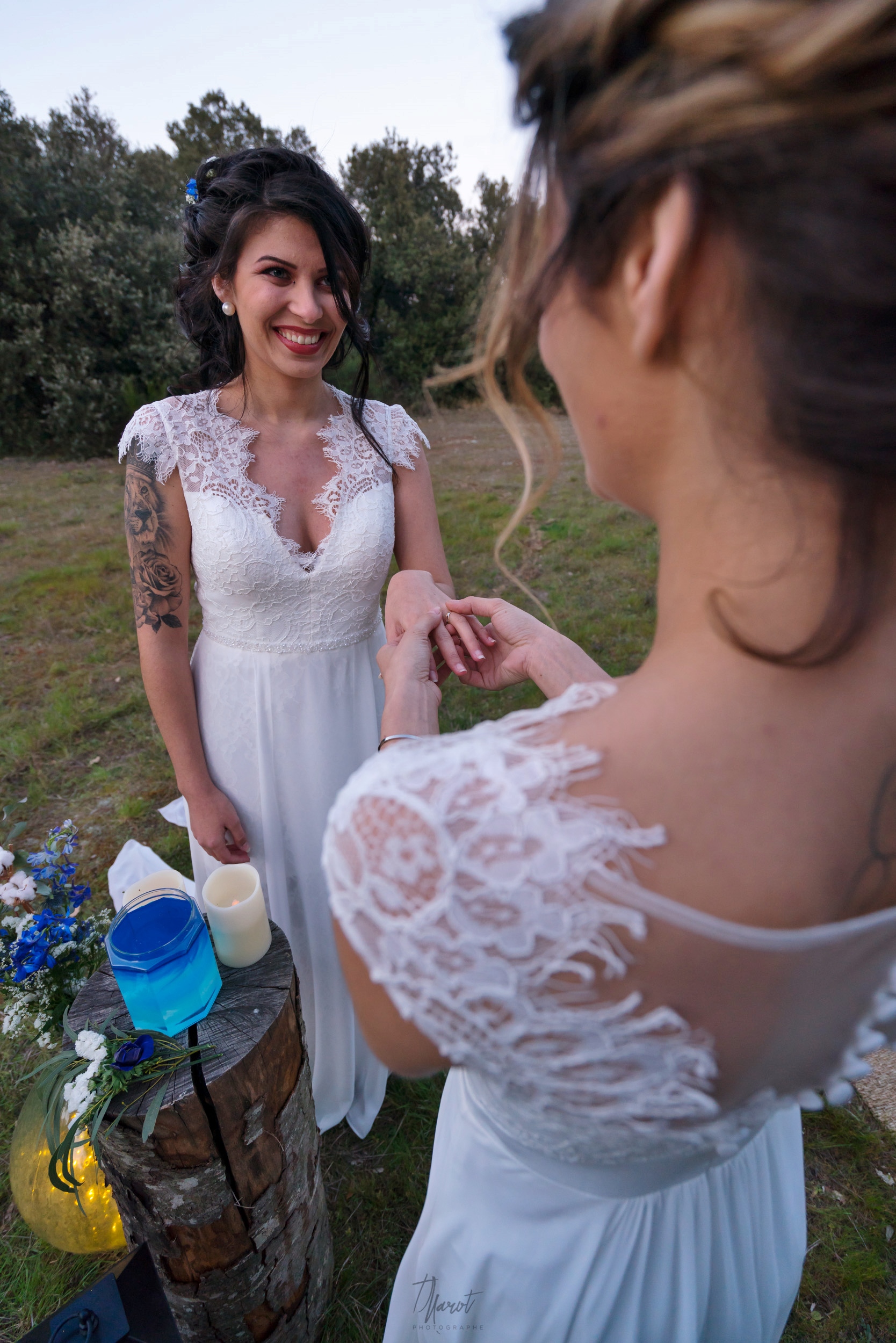 « Marine leur officiante de cérémonie a imaginé un joli rituel spécialement pour elles. Ensemble elles vont créer leur propre voie lactée en mêlant dans un geste, le bleu du ciel et une pluie d’étoiles.