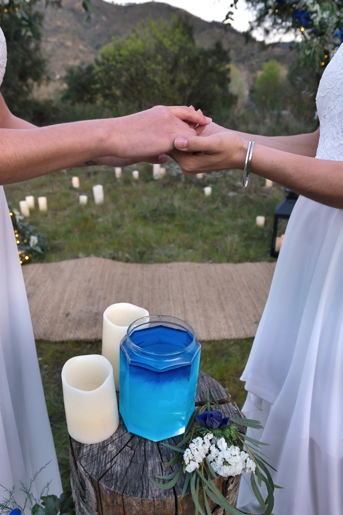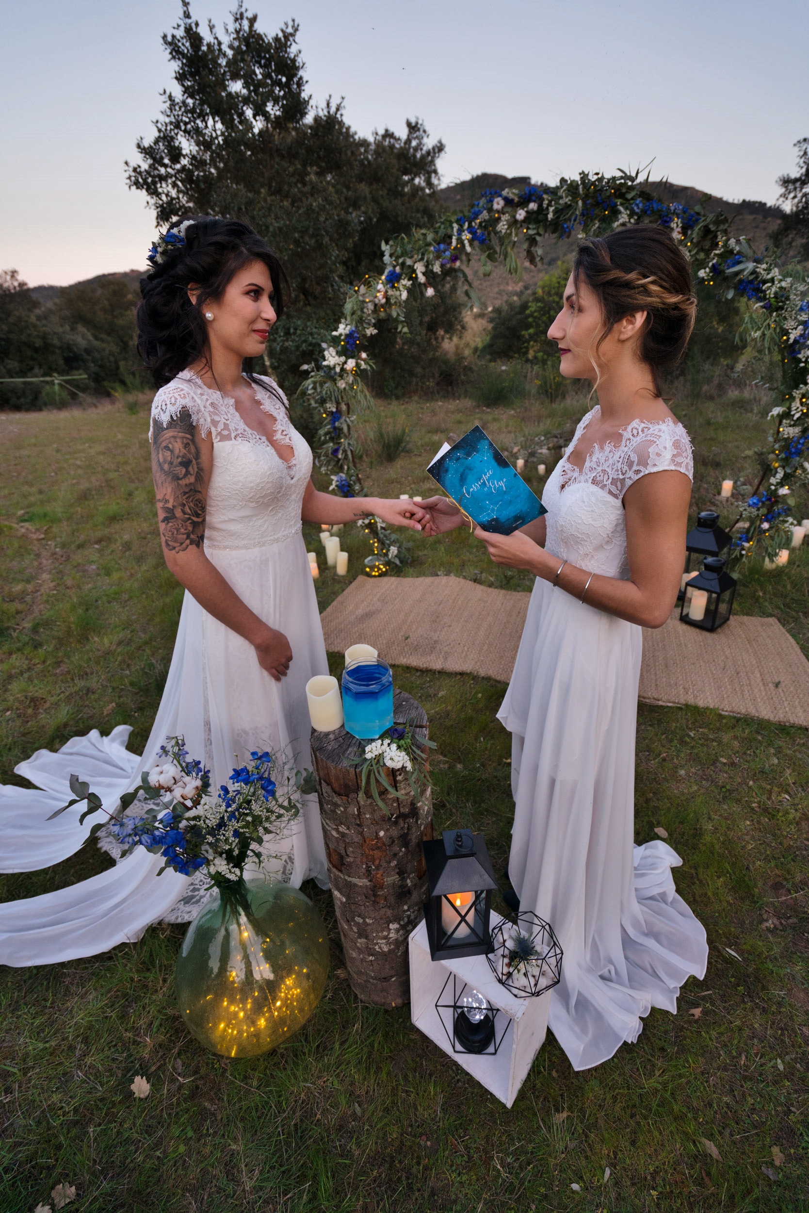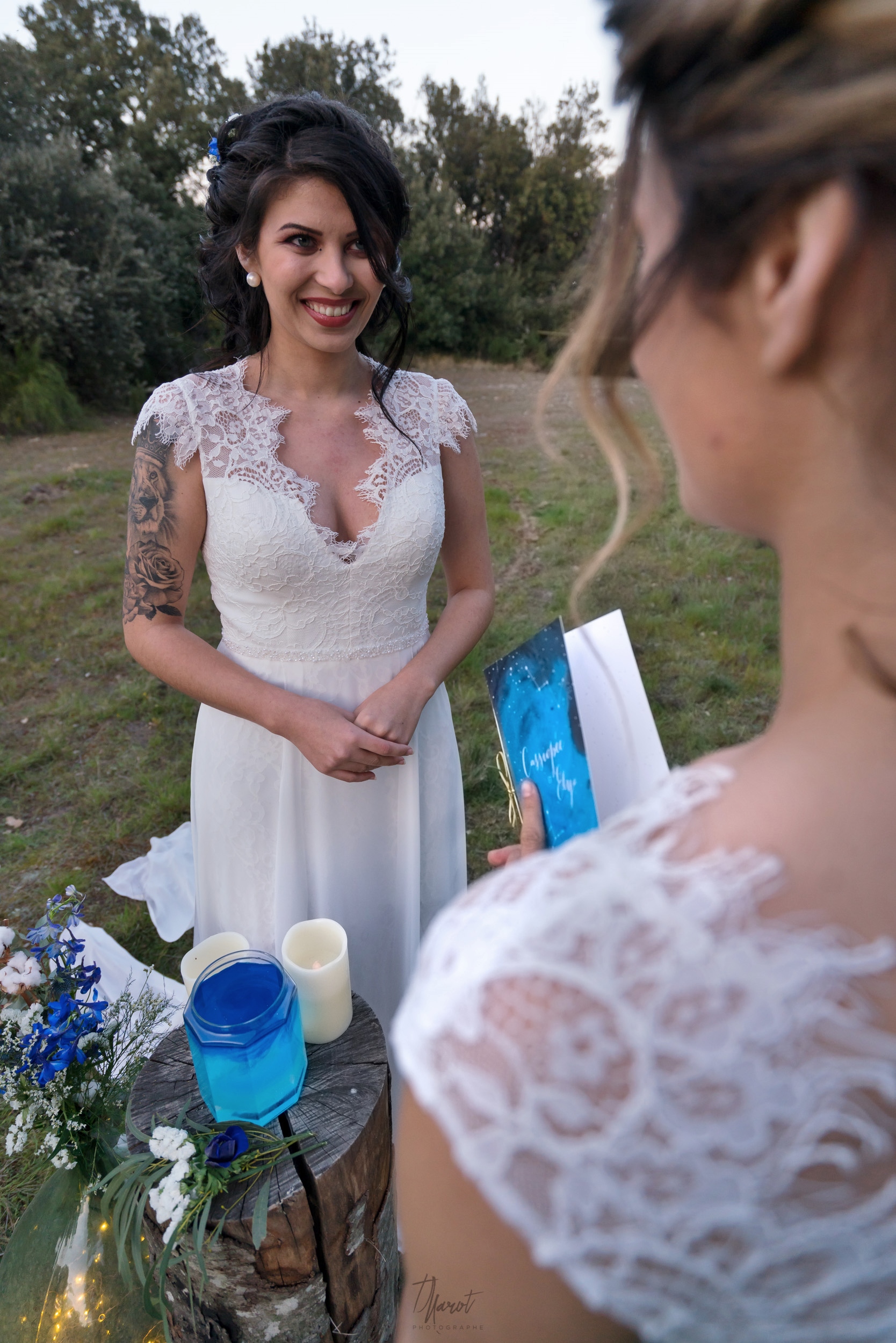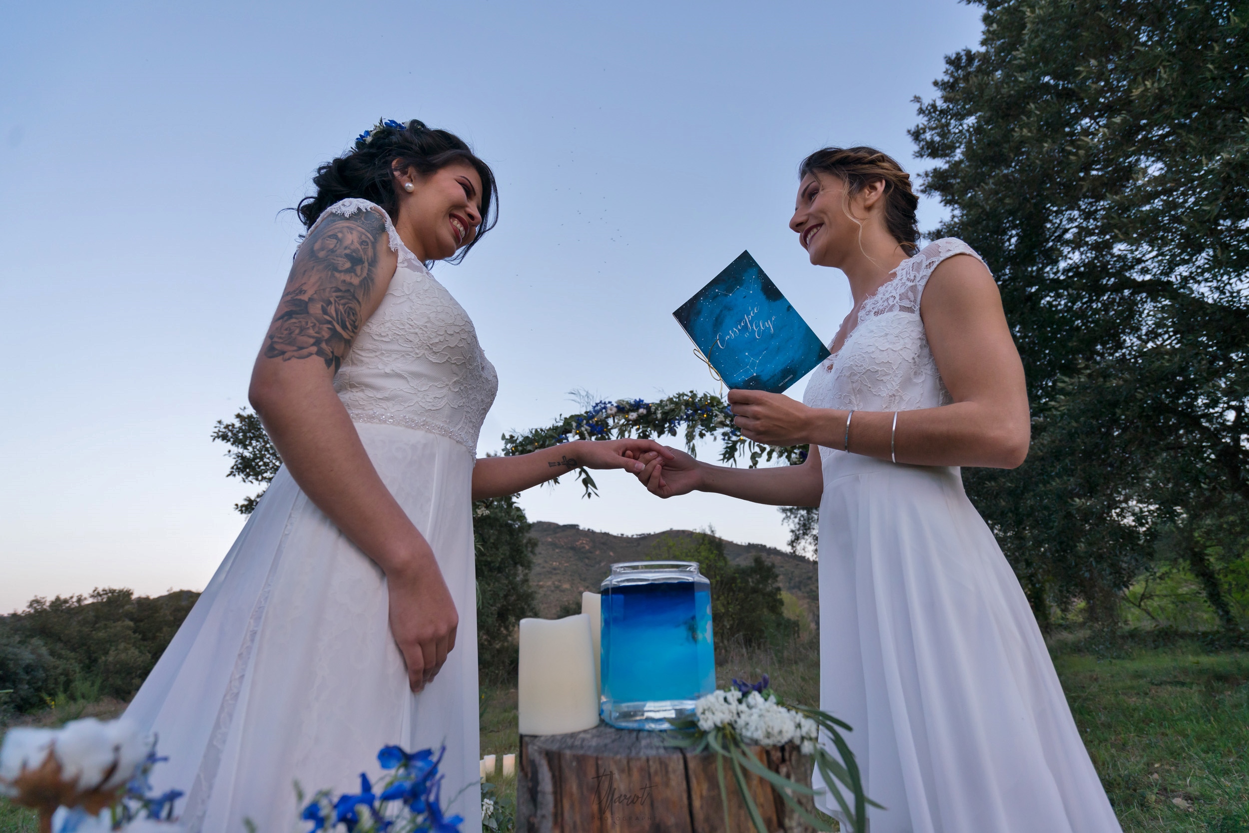 « Marine leur officiante de cérémonie a imaginé un joli rituel spécialement pour elles. Ensemble elles vont créer leur propre voie lactée en mêlant dans un geste, le bleu du ciel et une pluie d’étoiles.
