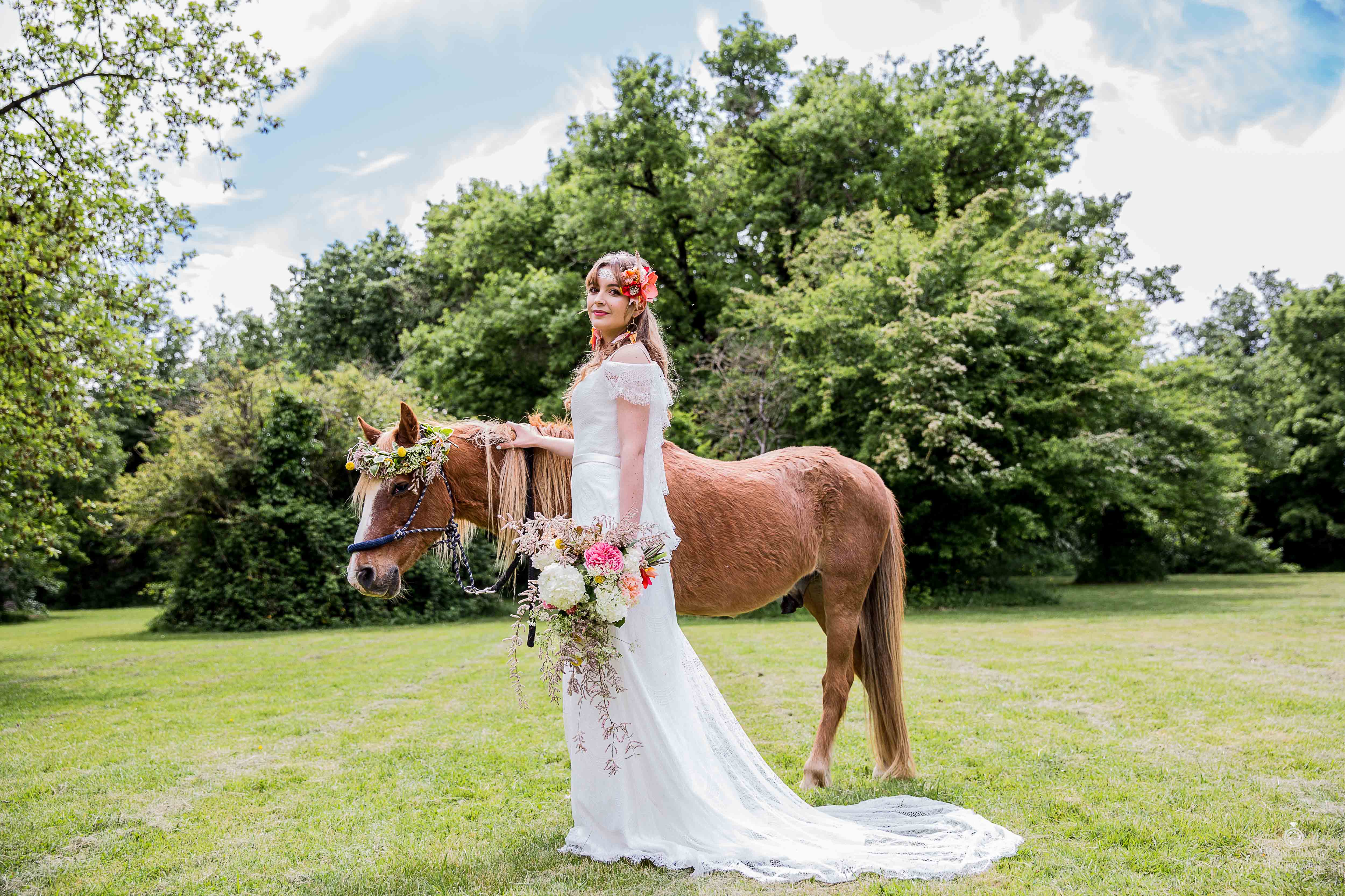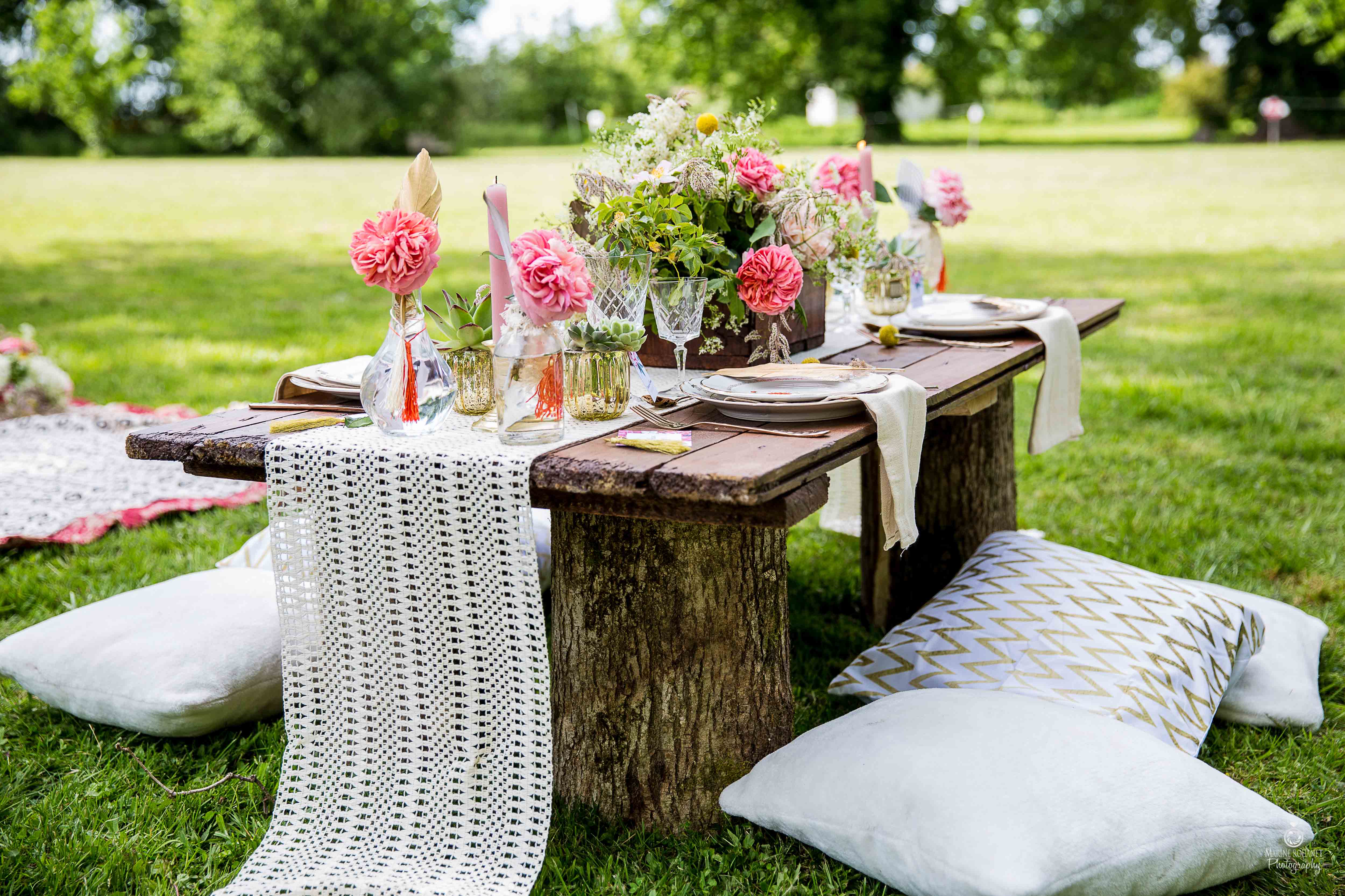 « Vous recherchez un esprit bohème ? Marcher pieds nues dans le sable, être allongés sous un tipi… Déjeuner sur l’herbe, des couronnes de fleurs autour de vos pieds… tout cela sous le chant des grillons ? Ce shooting Boho Chic est fait pour vous ! »