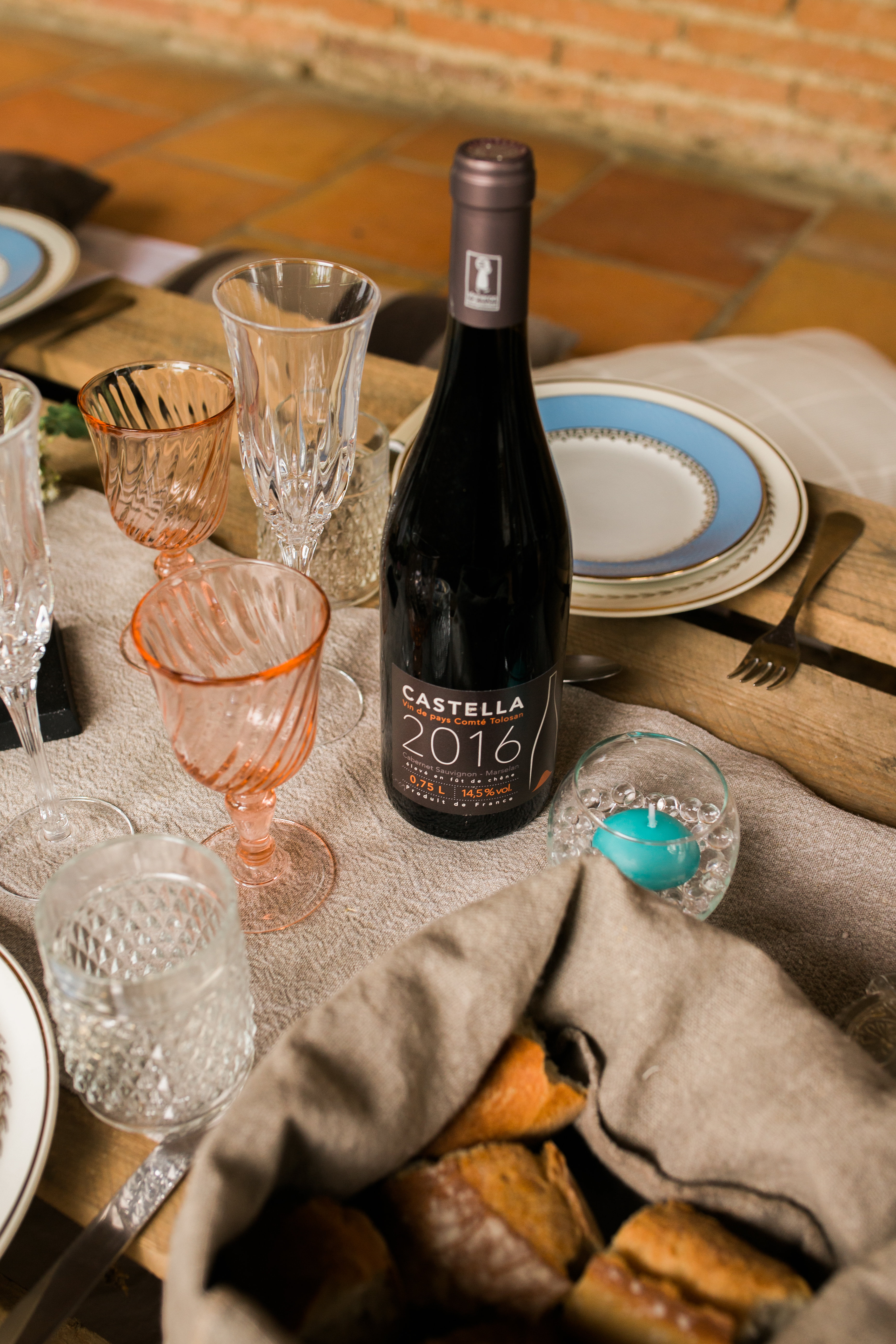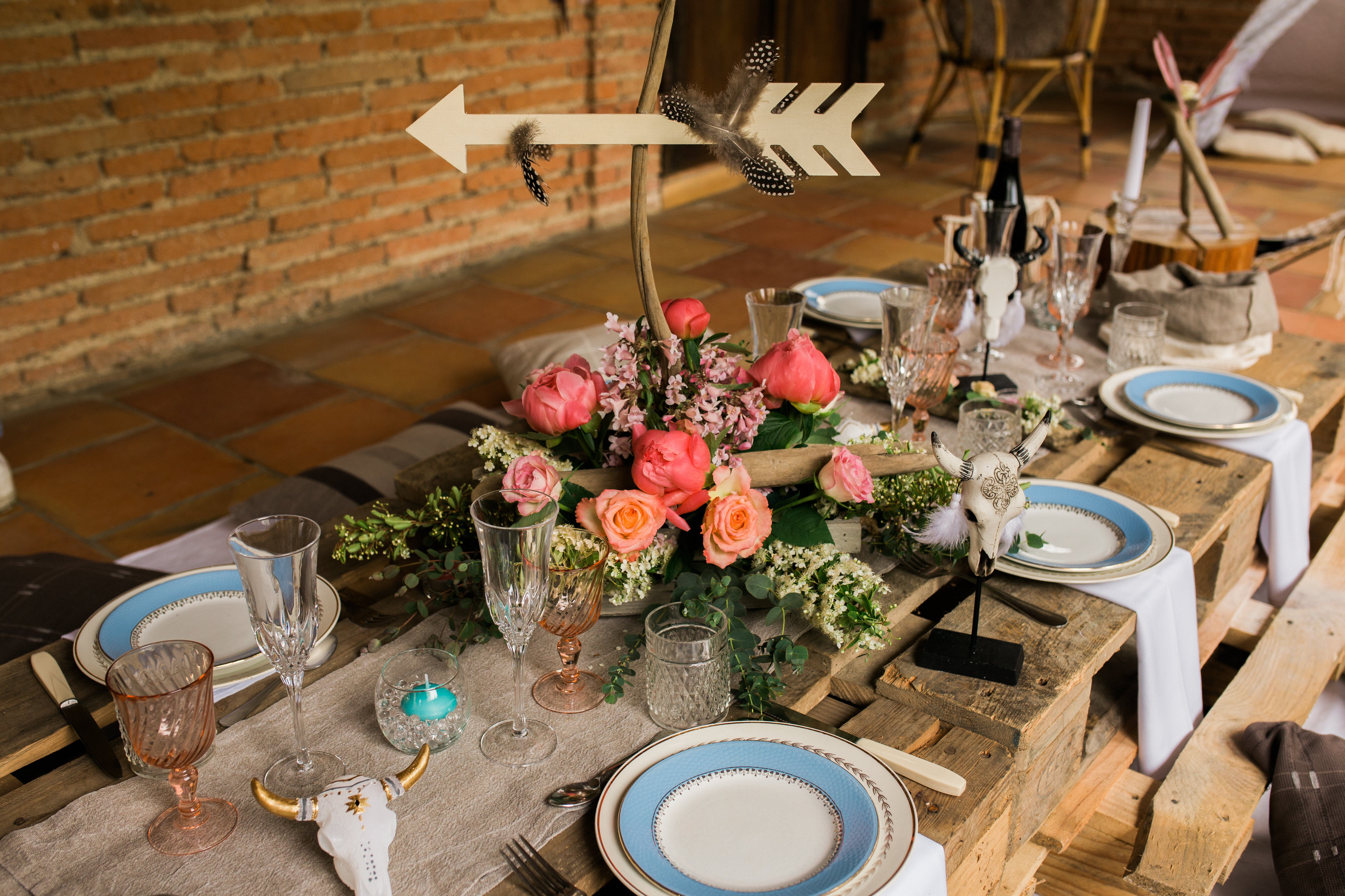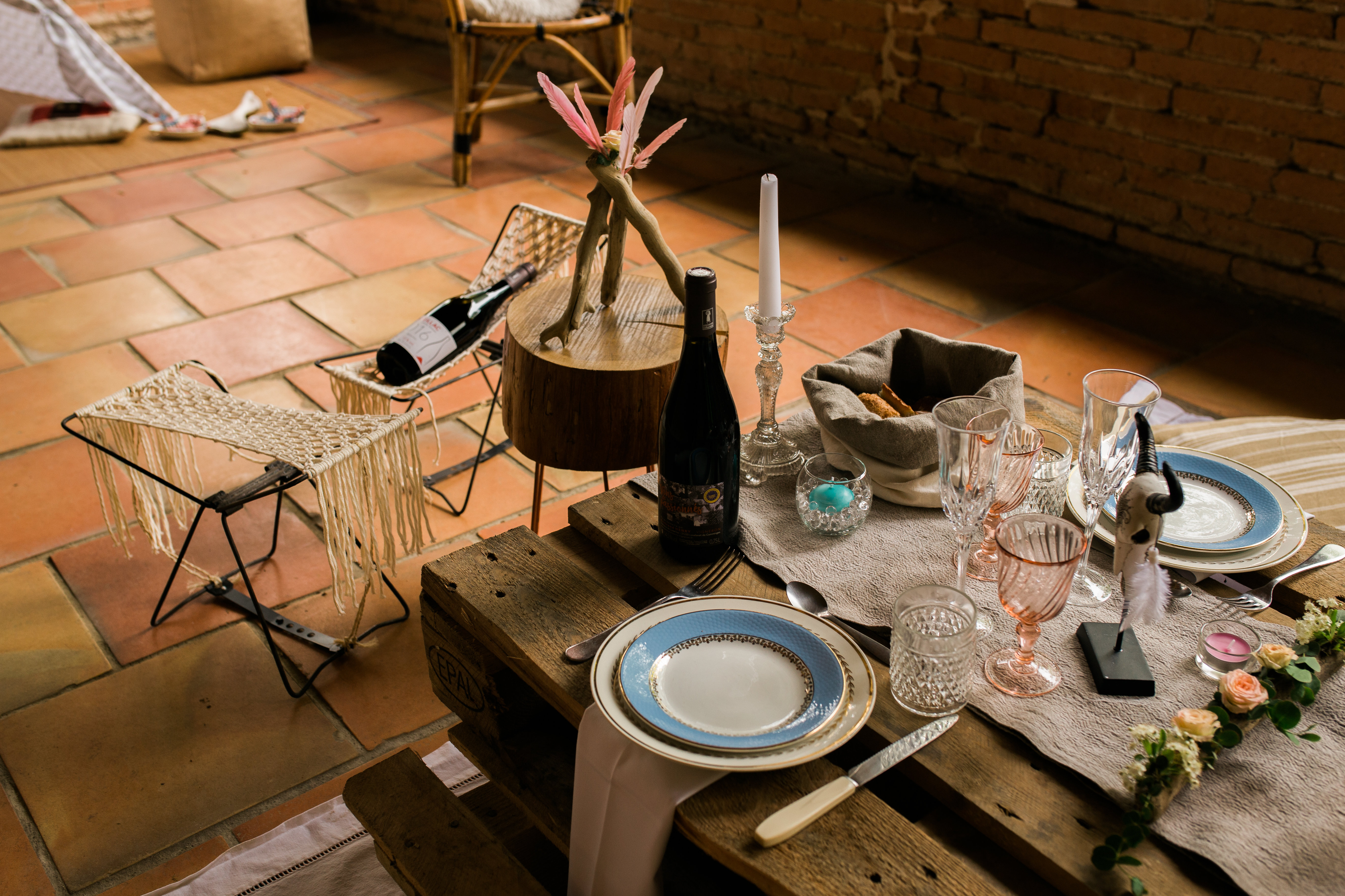 Ne cherchez pas non plus de décoration de table sophistiquée car palettes en bois, coussins au sol, accueillent les invités à cette tablée rustique et bohème.