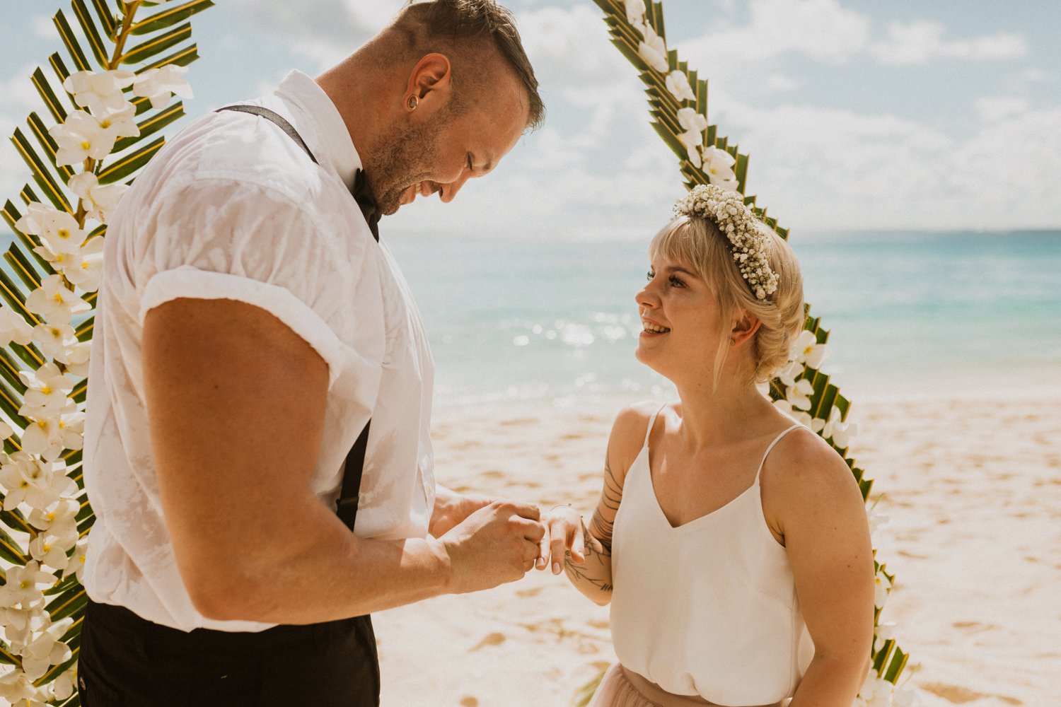 « Se marier pieds nus dans le sable, juste entre nous, pour que l’on puisse vraiment se concentrer sur nos émotions et l’importance du moment… Le jour « J », nous nous sommes mis en route pour la cérémonie, sans nous attendre à quoi que ce soit. On voulait se laisser porter, au rythme de nos envies et de notre amour l’un pour l’autre. »
