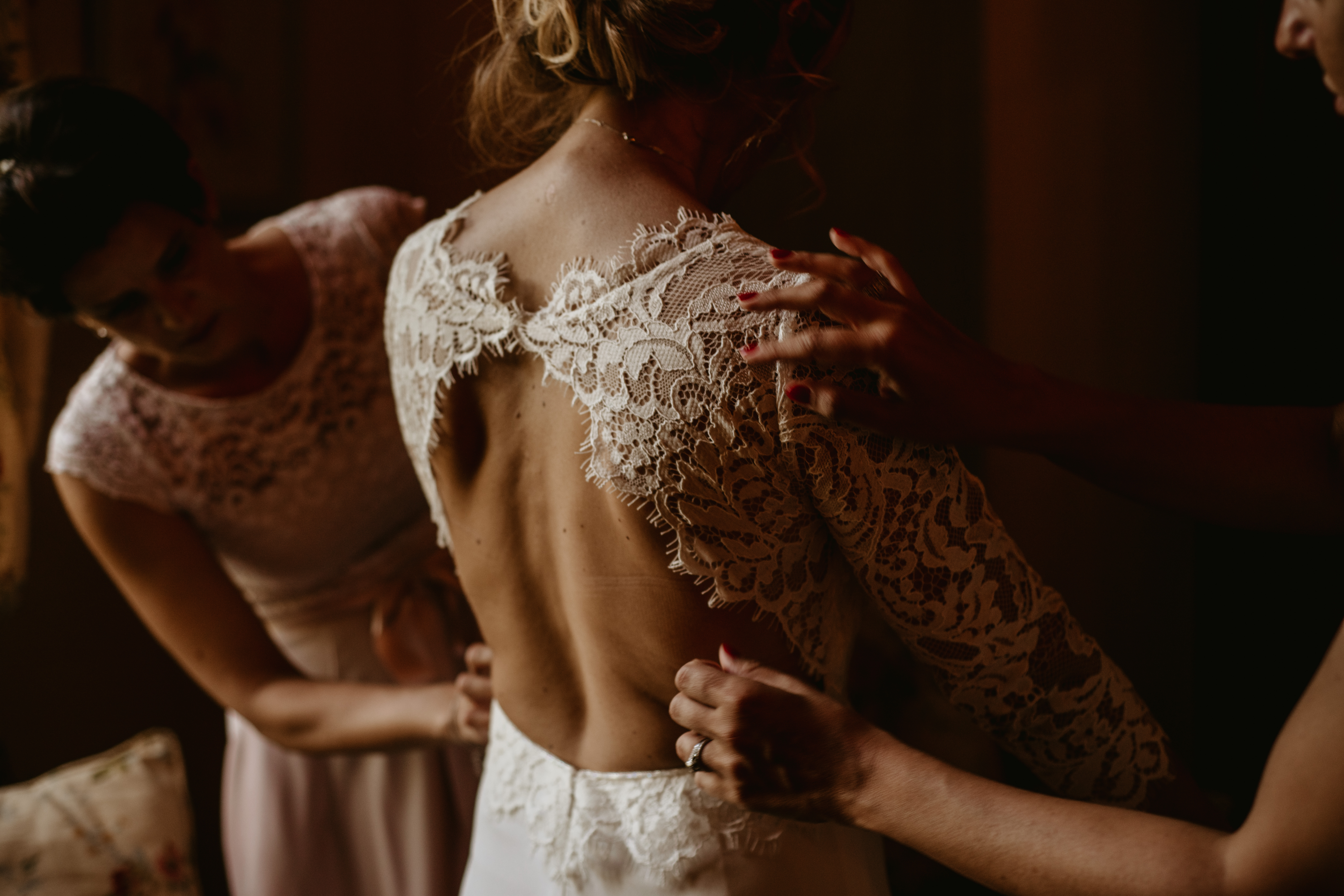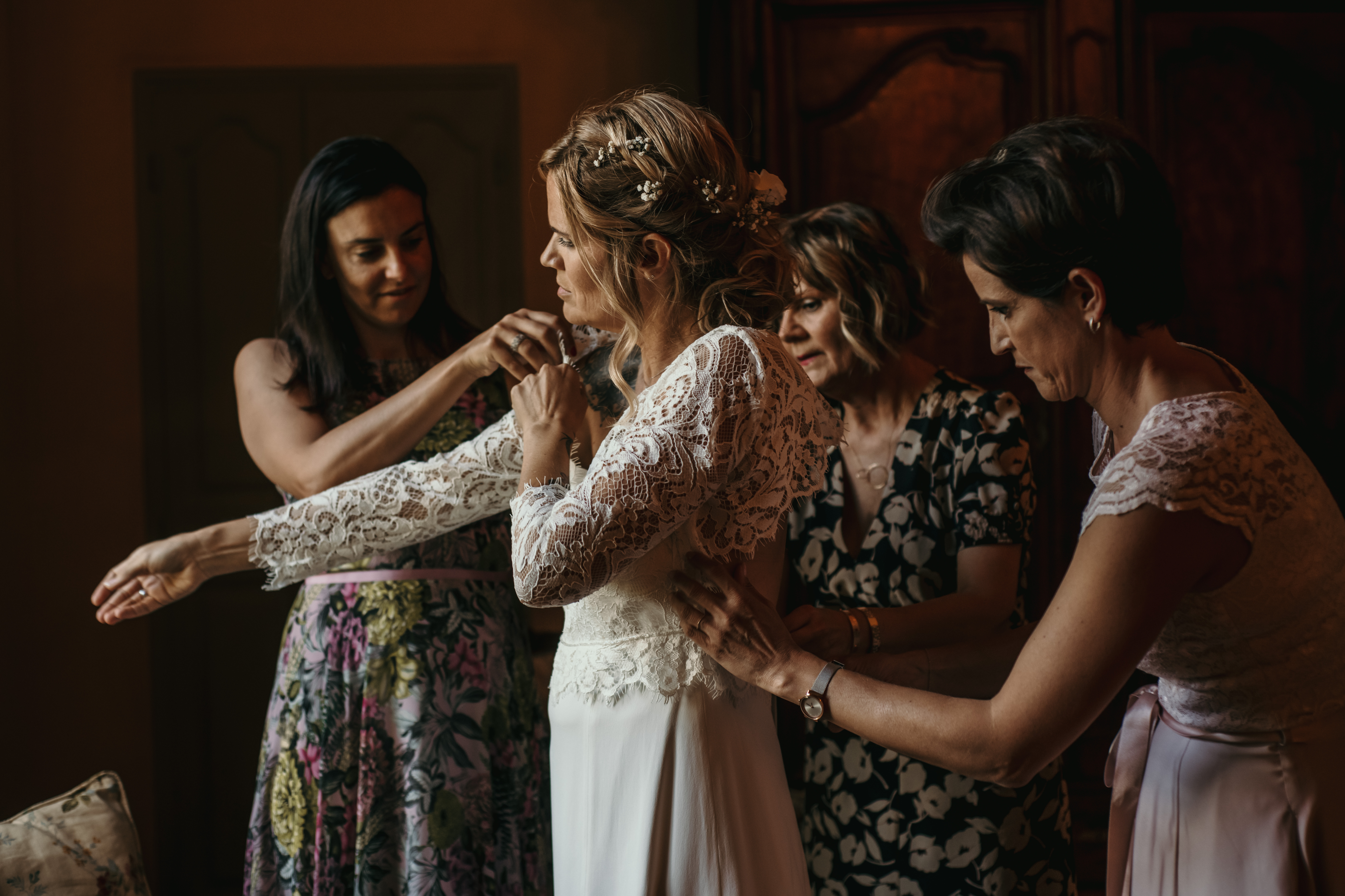 Emmanuelle s’est rendue dans sa chambre afin d’enfiler sa deuxième robe. LA robe, avec ses témoins et sa maman. Ce fut un magnifique moment, dans un cadre digne d’un film.