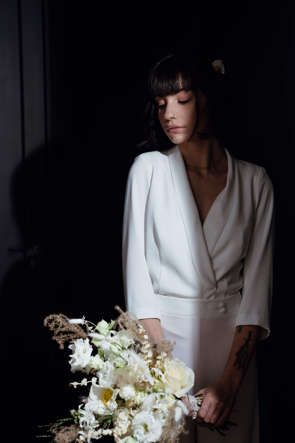 « Nous voulions montrer une mariée d’aujourd’hui, une femme moderne et affranchie. La rencontre avec Julie a été une belle aventure, elle était tellement elle et c’est ce que l’on cherchait, du caractère, du naturel et de l’élégance. Son tatouage assez discret lui ajoute ce petit côté urbain qui correspond exactement à ce que l’on imaginait »